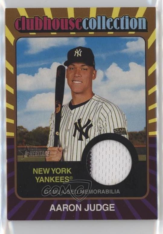 The product is a 2024 Topps Heritage trading card featuring Aaron Judge of the New York Yankees. This Clubhouse Collection Relic Gold card is a parallel variety with a limited print run of 99, making it a highly sought-after collectible. The card is made of card stock and includes a piece of memorabilia from the player, adding a unique element to the piece. With its vintage design and original manufacturing by Topps, this card is a must-have for any baseball card collector.