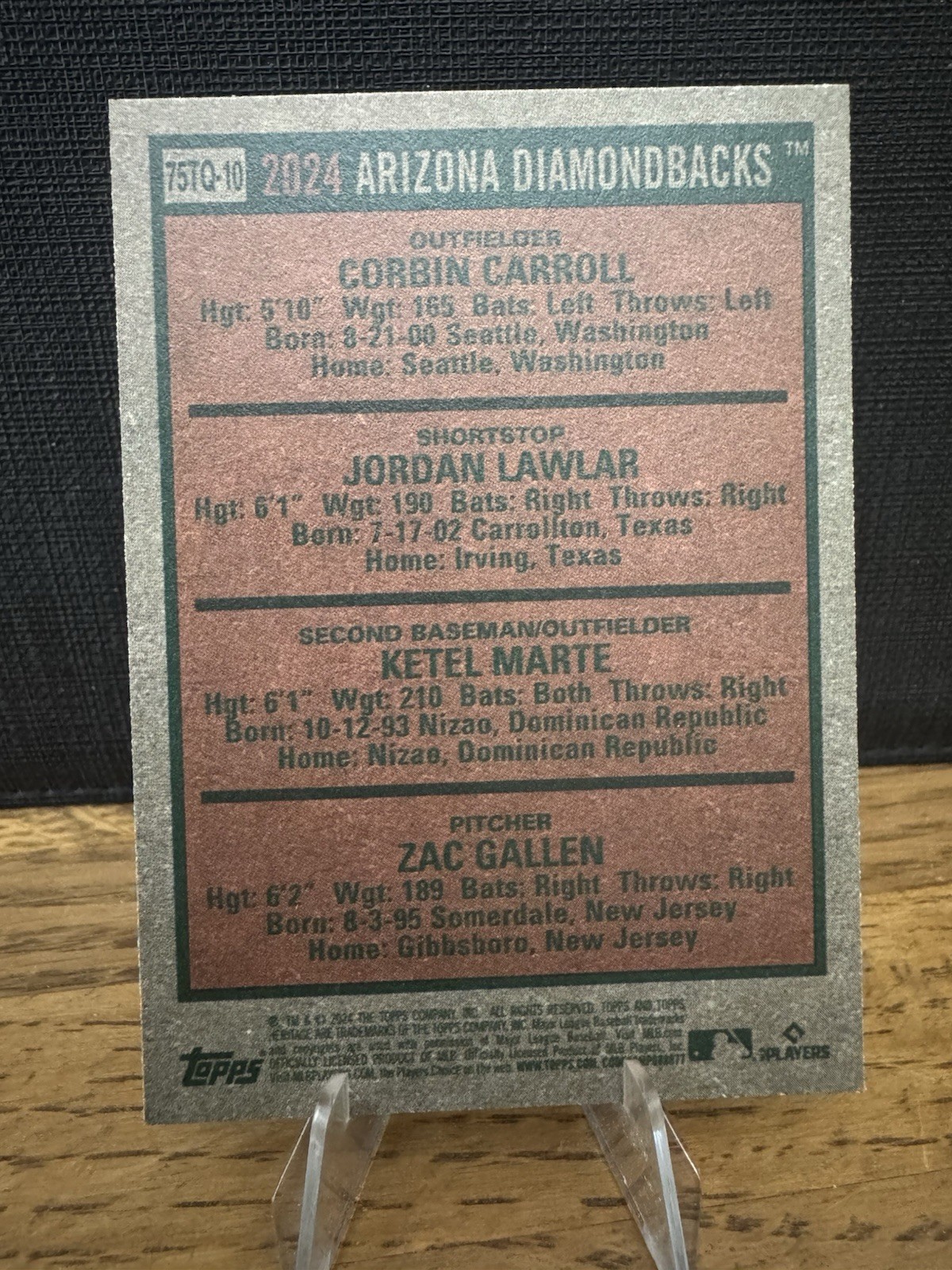 Enhance your collection with the 2024 Topps Heritage High Number Arizona Diamondbacks 1975 Team Quads #75TQ-10. This card features a dynamic quartet of Diamondbacks talent, including Corbin Carroll, Jordan Lawlar, Ketel Marte, and Zac Gallen. It's an original piece from the reputable manufacturer Topps, ensuring a quality addition to any baseball memorabilia assortment.Celebrating the Major League Baseball season, this card is part of the Heritage High Number set and represents the team's synergy during the 2024 campaign. Whether you're an avid collector or a fan of the Arizona Diamondbacks, this card captures the essence of the sport and the promise of a rising star.