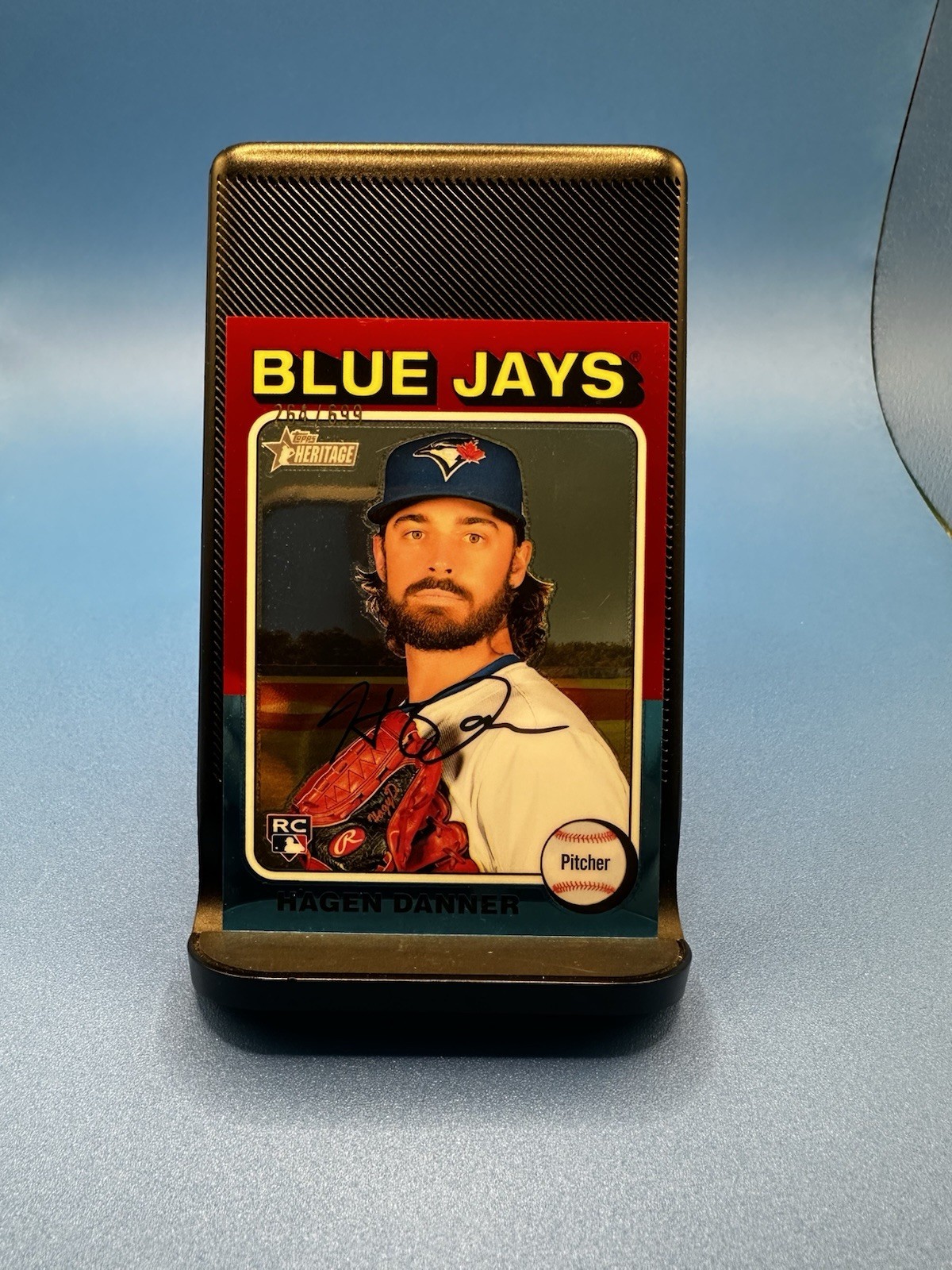 Card Details Player: Hagen Danner Team: Seattle Mariners Season: 2024–25 Card Set: 2024 Topps Heritage High Number – Chrome Card Number: #495 Insert Type: Base Chrome Rookie Card (RC) Season Statistics (2024 MLB) Games Pitched: 33 (Triple-A Buffalo) ERA: 3.15 Strikeouts: 34 Saves: 7 Major League: 1 game (0.1 innings), 0.00 ERA, 0 strikeouts Season Highlights Made MLB debut with Toronto in 2023—struck out first batter before exiting with an oblique injury. Spent majority of 2024 in Triple-A Buffalo, posting a 3.15 ERA over 33 appearances with solid strikeout and save totals. Claimed off waivers by the Seattle Mariners prior to Spring Training 2025 to add bullpen depth. Player Background Originally drafted in the second round by the Blue Jays in 2017 as a catcher, Danner converted to pitching in 2021. His fastball reaches the high 90s, paired with a sharp slider. He made his MLB debut in 2023 but was quickly sidelined due to injury. After a strong showing in Triple-A, he was added to Seattle’s 40-man roster ahead of the 2025 season and is now battling for a bullpen role.