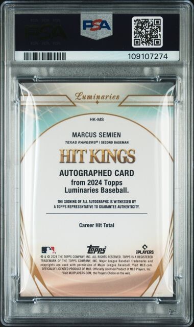 Up for sale is a 2024 Topps Luminaries Hit Kings Autographs Blue #HK-MS Marcus Semien – On-Card Autograph Serial Numbered 3/5, graded PSA 10 (Gem Mint) with Auto Grade 9. This Blue parallel of Marcus Semien from the premium Topps Luminaries Hit Kings Autographs series is limited to just 5 copies , with this one being serial numbered 3/5 . Professionally graded PSA 10 for the card and PSA 9 for the autograph, it’s a rare, high-grade gem for any elite collector. Card Details: Player: Marcus Semien Team: Texas Rangers Set: 2024 Topps Luminaries Insert Set: Hit Kings Autographs Card Number: #HK-MS Parallel: Blue Autograph: On-card Serial Number: 3/5 Card Grade: PSA 10 (Gem Mint) Auto Grade: PSA 9 Certification Number: 109107274 About the Card: The Blue parallel is one of the most limited and visually striking variations in the 2024 Topps Luminaries lineup. With its on-card autograph , bold design, and ultra-low /5 print run , this card is a true showpiece. Semien’s consistent elite-level performance makes this a prime investment and centerpiece for Texas Rangers fans and autograph collectors alike. Why This Card? ✅ Blue Parallel – limited to just 5 copies ✅ On-card autograph – clean and bold ✅ Serial numbered 3/5 ✅ PSA 10 (Gem Mint) card grade ✅ PSA 9 autograph grade ✅ Part of Topps’ premium Luminaries product Add this POP-worthy Blue /5 PSA 10 auto of Marcus Semien to your high-end collection today—rare, pristine, and championship-caliber. Thanks for looking, and happy collecting! ⚾🔵🔥