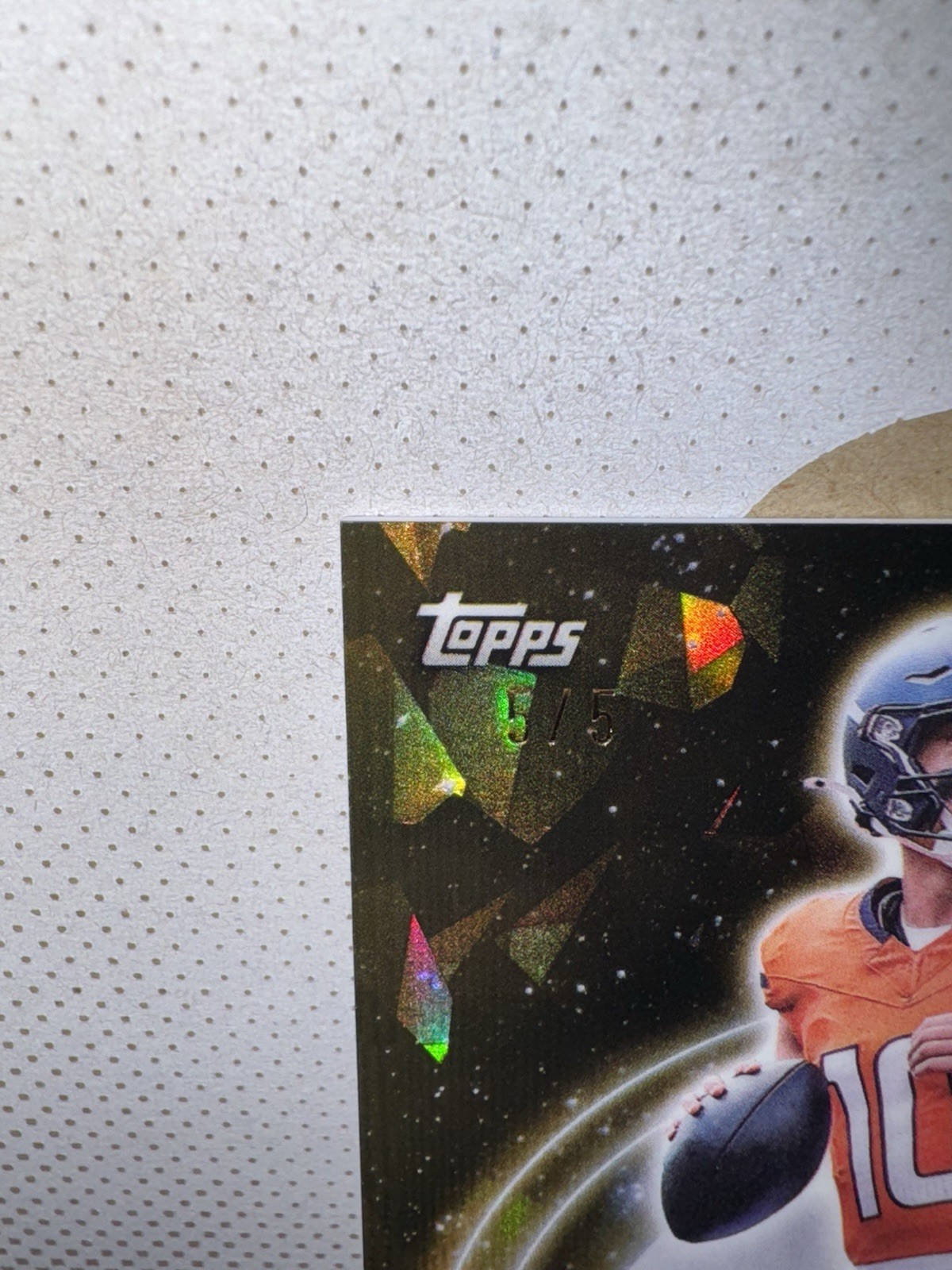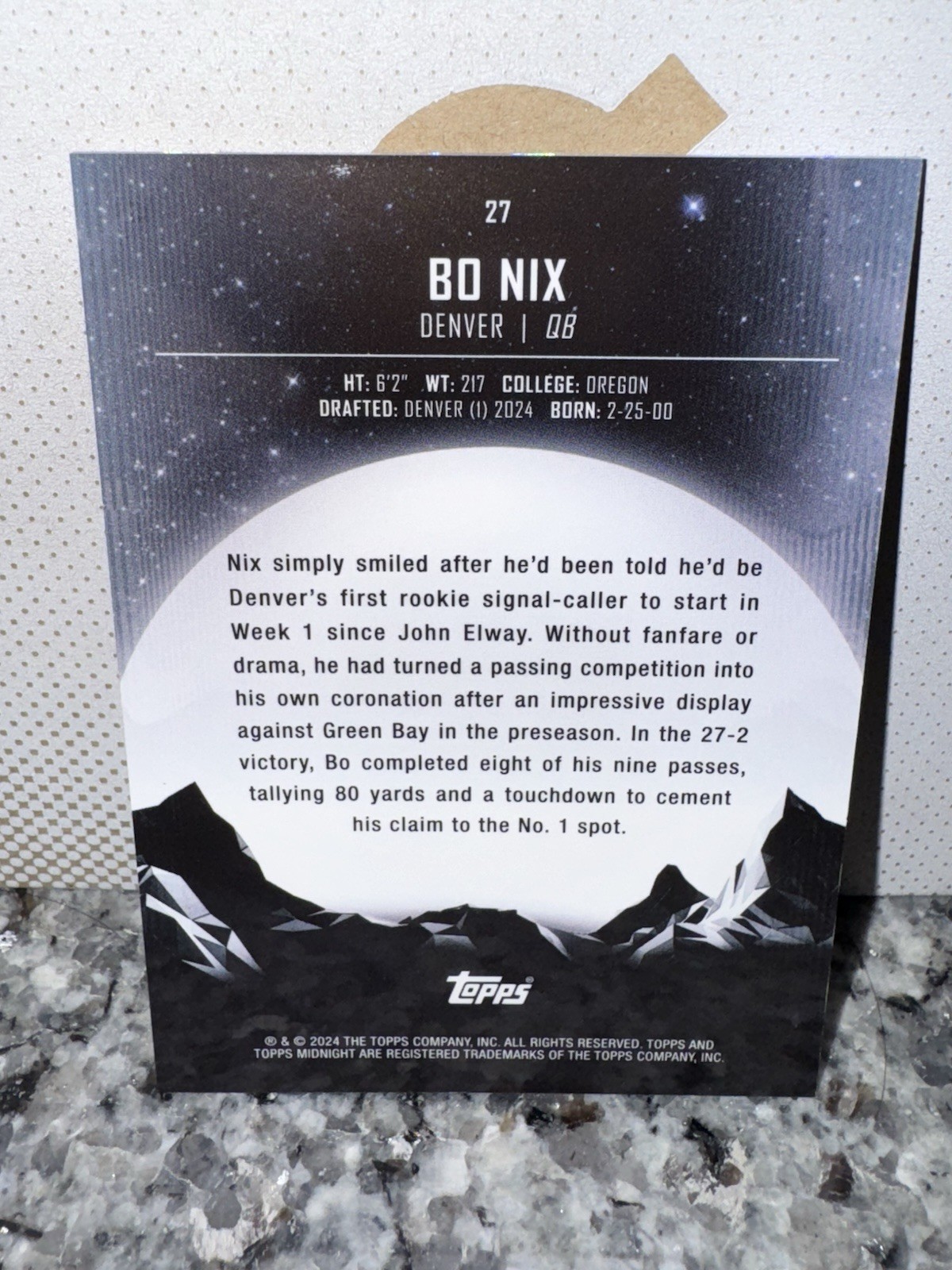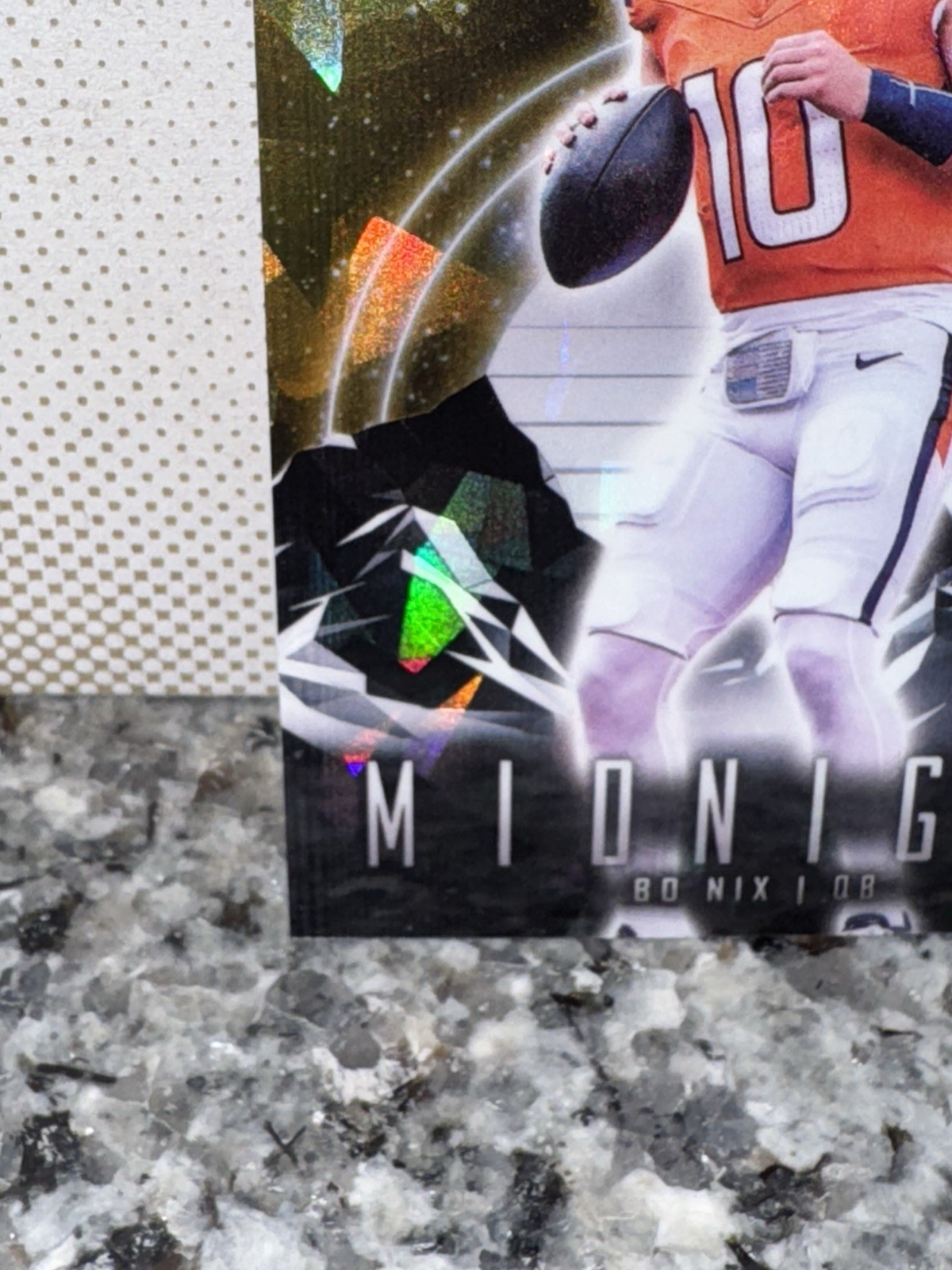 The 2024 Topps Midnight Rookie Bo Nix 5/5 card is a rare and sought-after collectible for fans of the National Football League. This sports trading card features a standard size and is made of high-quality card stock. Bo Nix, a promising rookie player from the Denver Broncos, is showcased in the card, making it a valuable addition to any football card collection. adding authenticity to this limited edition card that is sure to be a standout piece for collectors. 5/5 Book end 🔥🔥