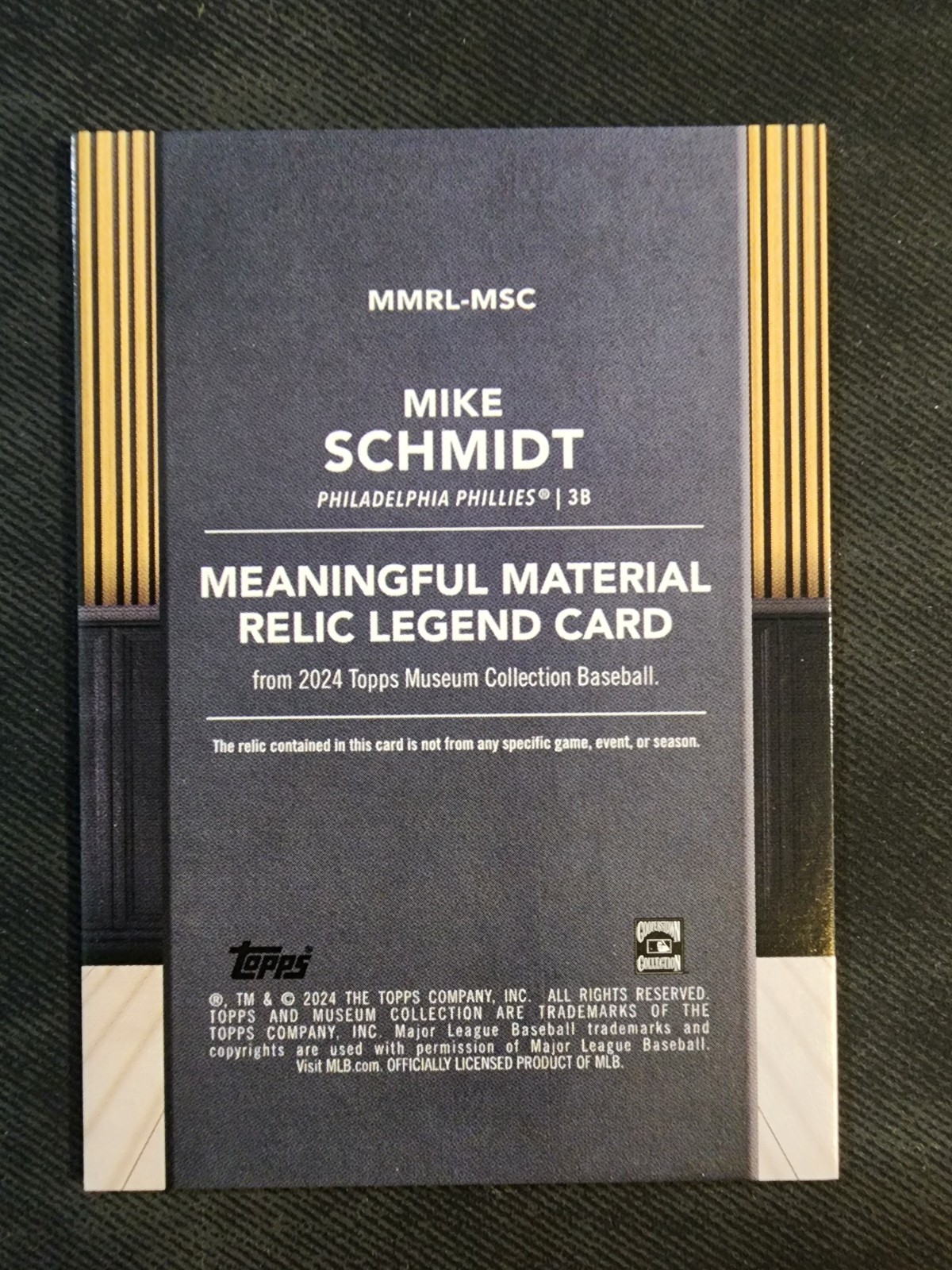 The 2024 Topps Museum Meaningful Material Legend Relics #MMRLMSC Mike Schmidt /99 is a highly collectible sports trading card featuring a relic from baseball legend Mike Schmidt. Part of the Topps Museum Collection, this single card is serial numbered and made with memorabilia, making it a unique piece for fans and collectors alike. With a focus on modern baseball players and teams, this item is a valuable addition to any sports memorabilia collection, especially for fans of the Philadelphia Phillies and Mike Schmidt.