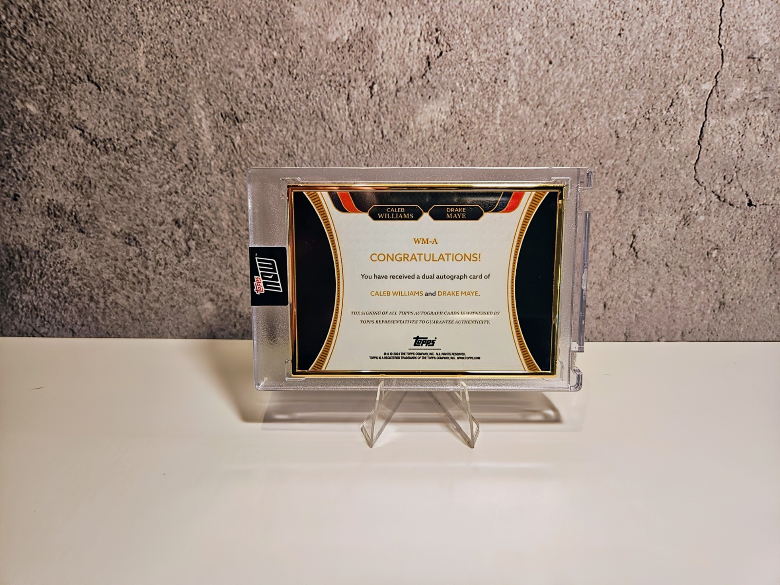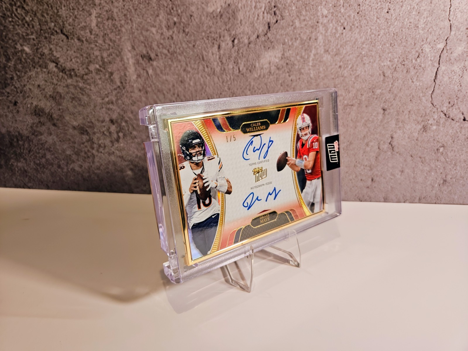 The product is a rare 2024 Topps QB Rookie Campaign Dual Auto trading card featuring Caleb Williams and Drake May, both signed by the players themselves. Limited to a print run of only 5, this special short print card is framed and serial numbered, making it a highly sought-after collectible for football fans and card enthusiasts. With a gold border and exclusive rookie designation, this limited edition card is a valuable addition to any sports trading card collection, showcasing promising talent from the NFL in the 2024 season.