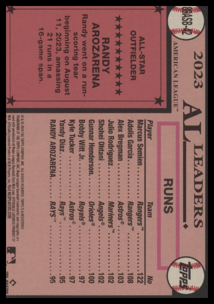 This is a nice example of a 2024 Topps #89ASB-42 Randy Arozarena 1989 Topps Baseball 35th Anniversary All-Stars Other important information about this card: In 2024 Randy Arozarena played for the Tampa Bay Rays. Please check out our other listings for more great cards.