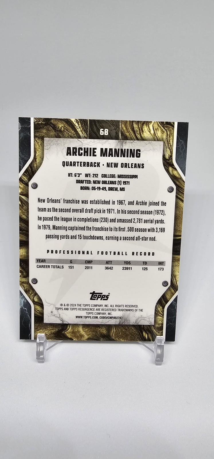 The product is a 2024 Topps Resurgence trading card featuring Archie Manning of the New Orleans Saints, part of the base set. This original card is made of card stock with a silver hyper parallel variety, in near mint or better condition. It is an ungraded card with a label or sticker autograph, manufactured by Topps in the United States. The card showcases Manning in his Saints uniform, making it a valuable and collectible piece for fans of football memorabilia.