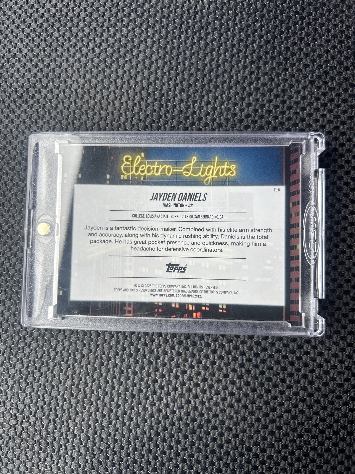 The product is a 2024 Topps Resurgence Jayden Daniels Rookie Card featuring the Electro Lights Special Parallel. This collectible sports trading card is manufactured by Topps and is part of the National Football League (NFL) set. The card is made of card stock material and is in near mint condition or better. It showcases Jayden Daniels, a player from the Washington Commanders, making it a valuable addition to any football card collection.
