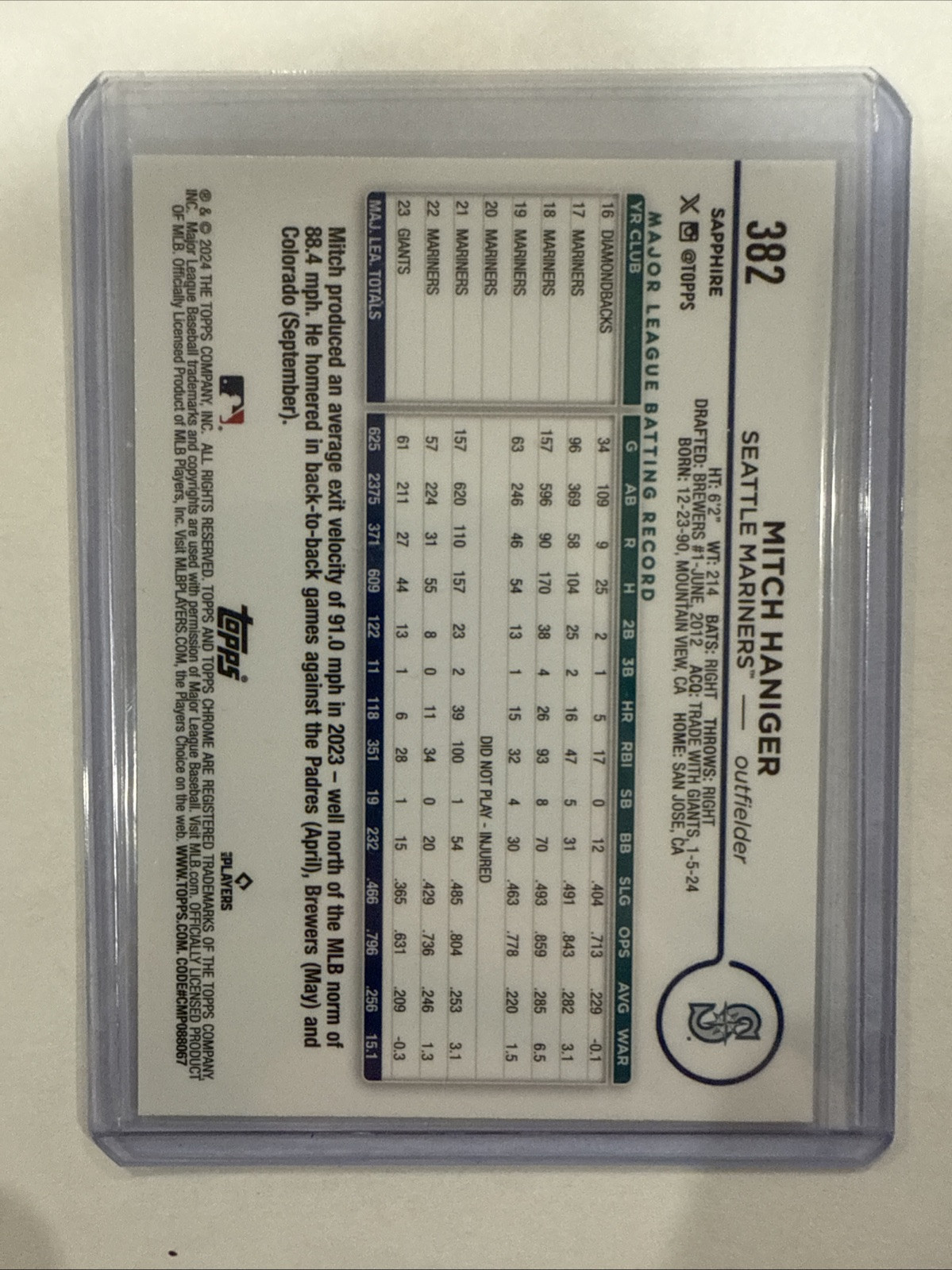 Elevate your baseball card collection with the 2024 Topps Chrome Sapphire Mitch Haniger Orange Refractor, card number 382. This limited edition piece, with a print run of just 25, features the standout Seattle Mariners player, capturing the essence of the game and the athlete's prowess on the field. The card is a must-have for fans and collectors alike, offering a unique snapshot of the 2024 MLB season. Crafted in the United States, this original card is produced by Topps, ensuring its authenticity and quality. It's a non-autographed gem that boasts serial numbering, adding an extra layer of exclusivity. The card is presented on premium card stock, making it a durable and visually appealing addition to any collection. With its connection to the MLB World Series event, this card holds the potential to become a treasured piece of baseball history.