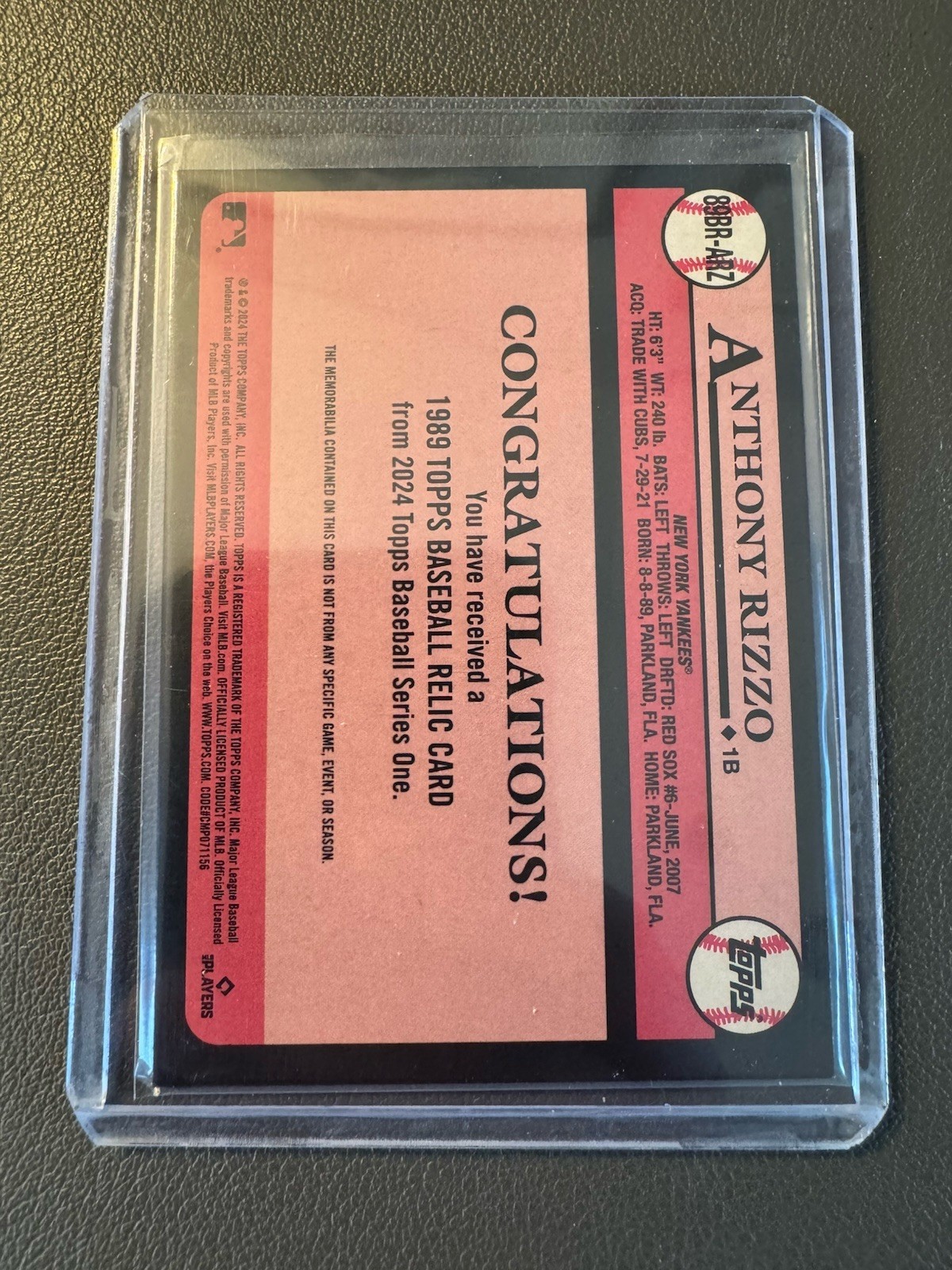 Discover a slice of baseball history with the 2024 Topps Series 1 - 1989 Topps Baseball Relics #89BR-ARZ featuring the formidable Anthony Rizzo. This sports trading card is a must-have for collectors and fans alike, showcasing a memorable relic from Rizzo's impressive career. Crafted to delight, the card is a tribute to the iconic 1989 Topps design, reimagined for today's enthusiasts. It's a celebration of the player's legacy, presented ungraded to allow you to appreciate its raw appeal or to seek professional grading for potential added value. Own a piece of the game with this timeless keepsake.