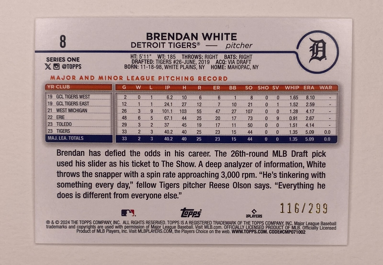 2024 Topps Series 1 Brendan White RC #8 - Tigers Color Parallel #116/299 Sweet Card! I am a long time collector and I opened the pack for every card I list. Raw cards with honest and un-edited photos. Please bid with confidence and enjoy the cards as much as I have. All cards are shipped securely in penny sleeve/top loader in a bubble envelope. Combine orders (+ $0.25/card) to save on shipping.