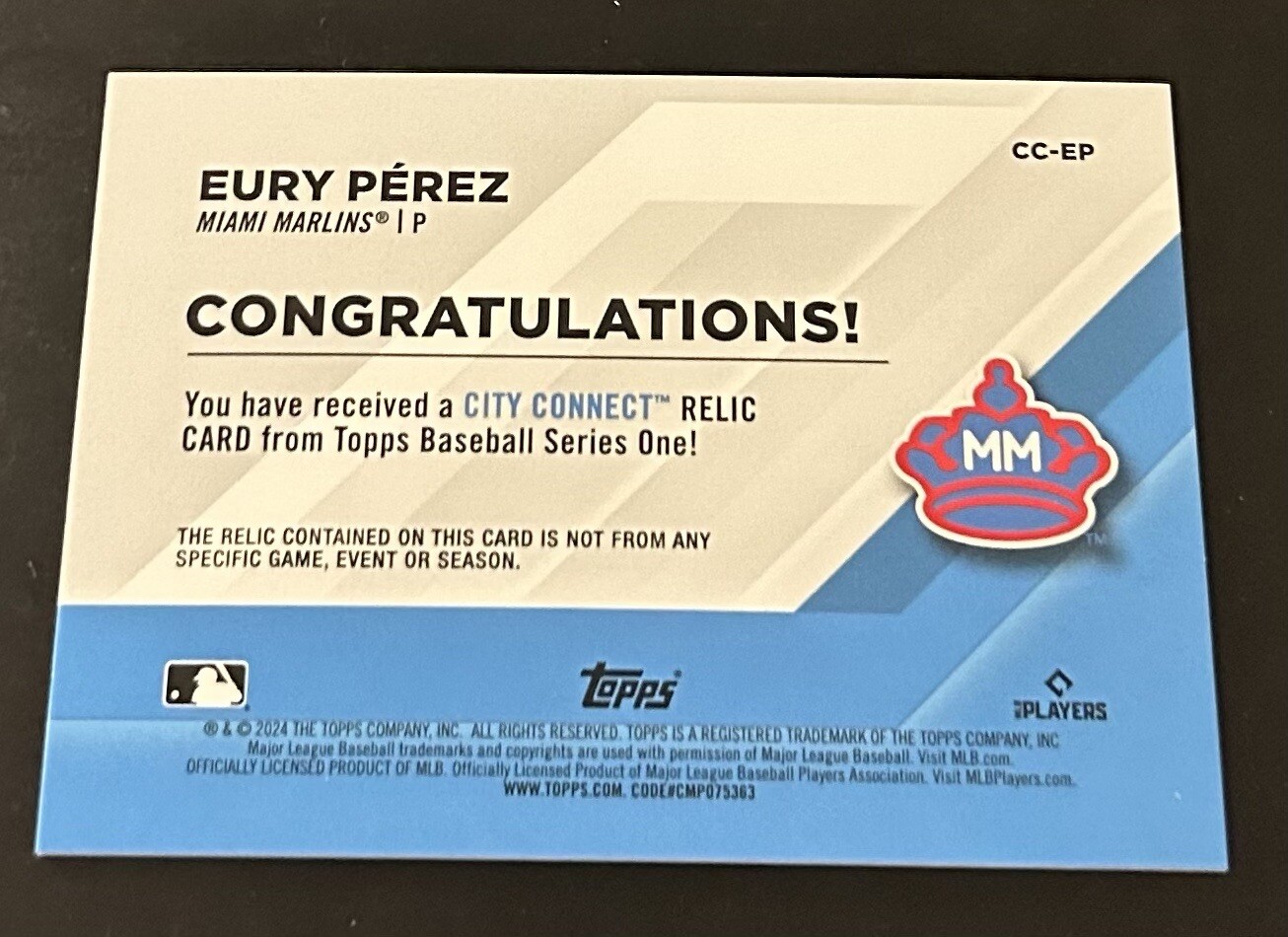 2024 Topps Series 1 City Connect Jersey Relic Eury Perez Miami Marlins