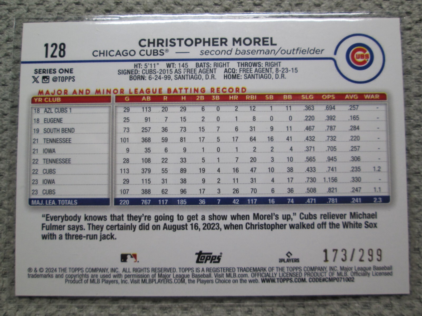 This card is a must-have for collectors! The vibrant orange crackle design makes it stand out, and with only 299 printed, it's a rare gem. Morel's Future Stars spotlight adds great value—perfect for Cubs fans or anyone chasing unique rookie cards. A fantastic addition to any collection!