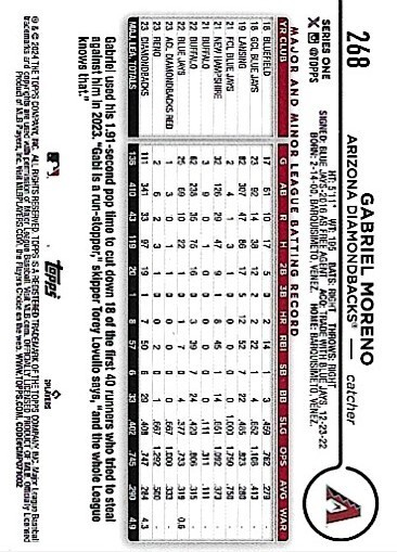 The product is a 2024 Topps Series 1 trading card featuring Gabriel Moreno, designated as a future star for the Arizona Diamondbacks. The card is an original print, measuring 3¼" x 2½", and does not include an autograph. Manufactured by Topps, this card is part of the Baseball franchise and is a must-have for fans of the sport looking to collect unique and valuable trading cards. With the player's potential and the card's rarity, it is a coveted item for any baseball card enthusiast.