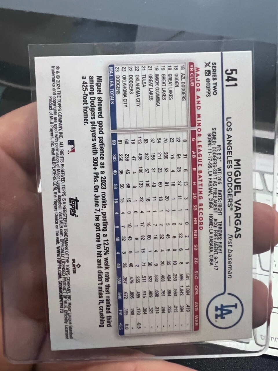 Set:2024 Topps Series 2Manufacturer:ToppsSeason:2024Sport:BaseballType:Sports Trading CardLeague:Major League (MLB)Player/Athlete:Miguel VargasTeam:Los Angeles DodgersCard Number:541Autographed:NoParallel/Variety:Black Foil