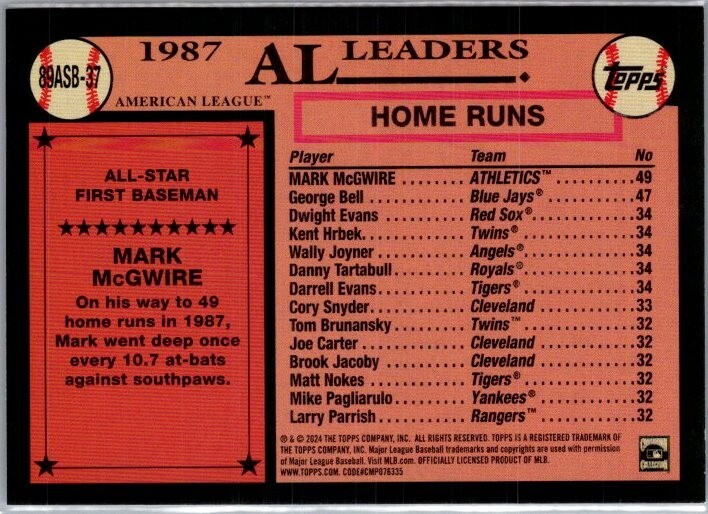 The product is a 2024 Topps Series 2 Mark McGwire trading card featuring the All-Stars from the 1989 Oakland Athletics team. This sports trading card, part of the Major League Baseball set, showcases the legendary baseball player in a special insert design. Manufactured by Topps, this card is a collectible piece for fans and collectors of baseball memorabilia, highlighting a significant player from the 1989 season.
