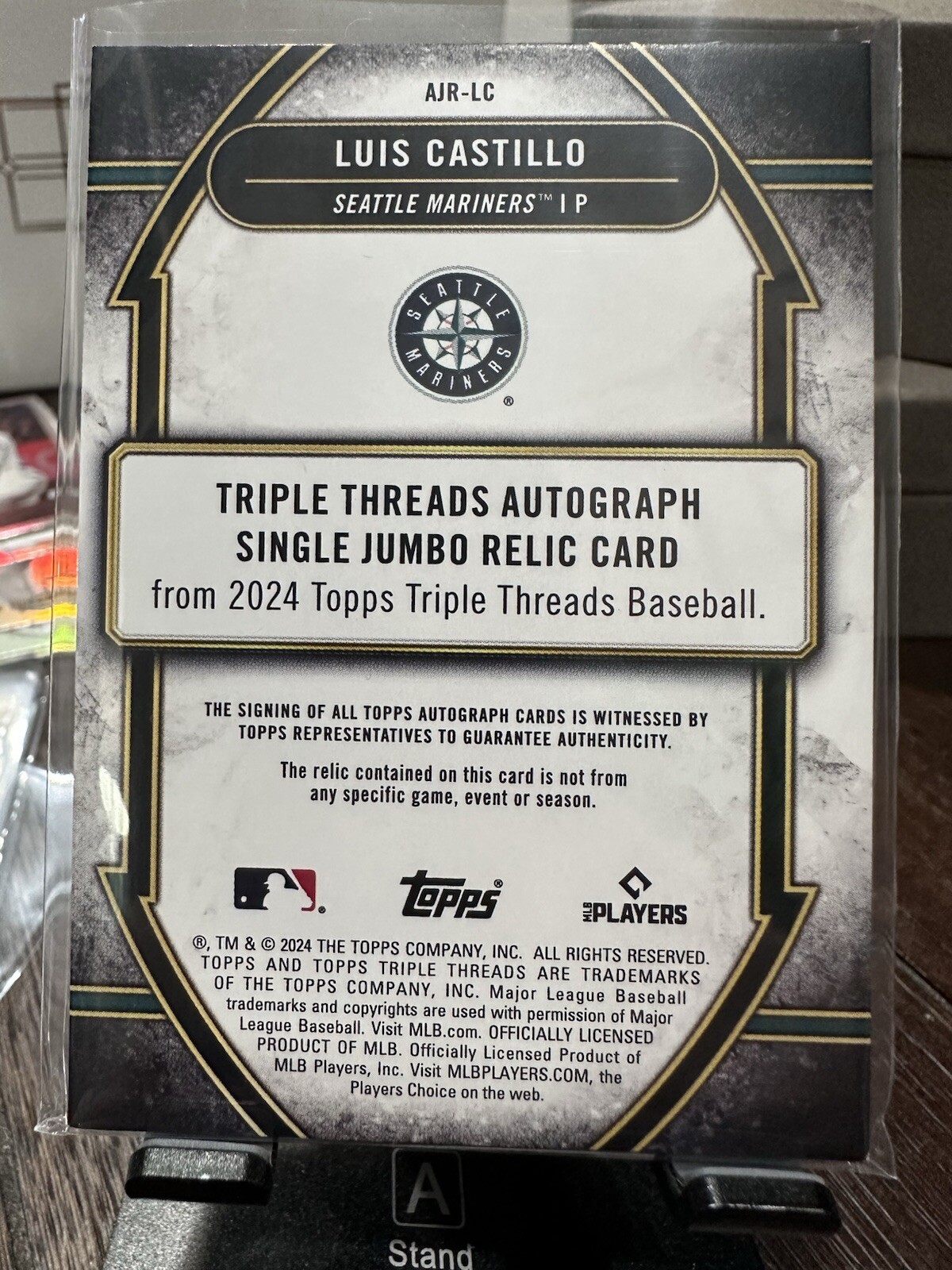 2024 Topps Triple Threads Luis Castillo Single Jumbo Relic Gold Auto /25 #AJR-LC Any notable flaws or damage putting them outside the condition stated in this listing will be noted. Please use photos provided for your own assessment. Graded card cases may come chipped, scratched, and scuffed. I do not offer partial refunds or returns because of the case condition. All single cards will come in protective cases. If you purchase a listing that's sold as a lot it may come in snap cases or sealed in a team bag, and not all cards will be individually sleeved and top loaded in all lots. Raw cards are sold as such, and no questions regarding expected grade or guarantees of such will be responded to. Condition is noted as used - cards can have any number of issues that do not detract from the overall look of the image on the card. These issues can include scratches/surface wear, and flaws on edges and corners. See photos provided for centering condition as well as to make your own assessment of card condition. Cards with Standard eBay Envelope delivery will be delivered in a 4x8 bubble mailer with card toploaded and sealed in a team bag. All orders will be processed and packaged within 1-2 business days. Orders with Standard eBay Envelope delivery, please expect a further estimated delivery time. More pictures can be provided upon buyer's request.