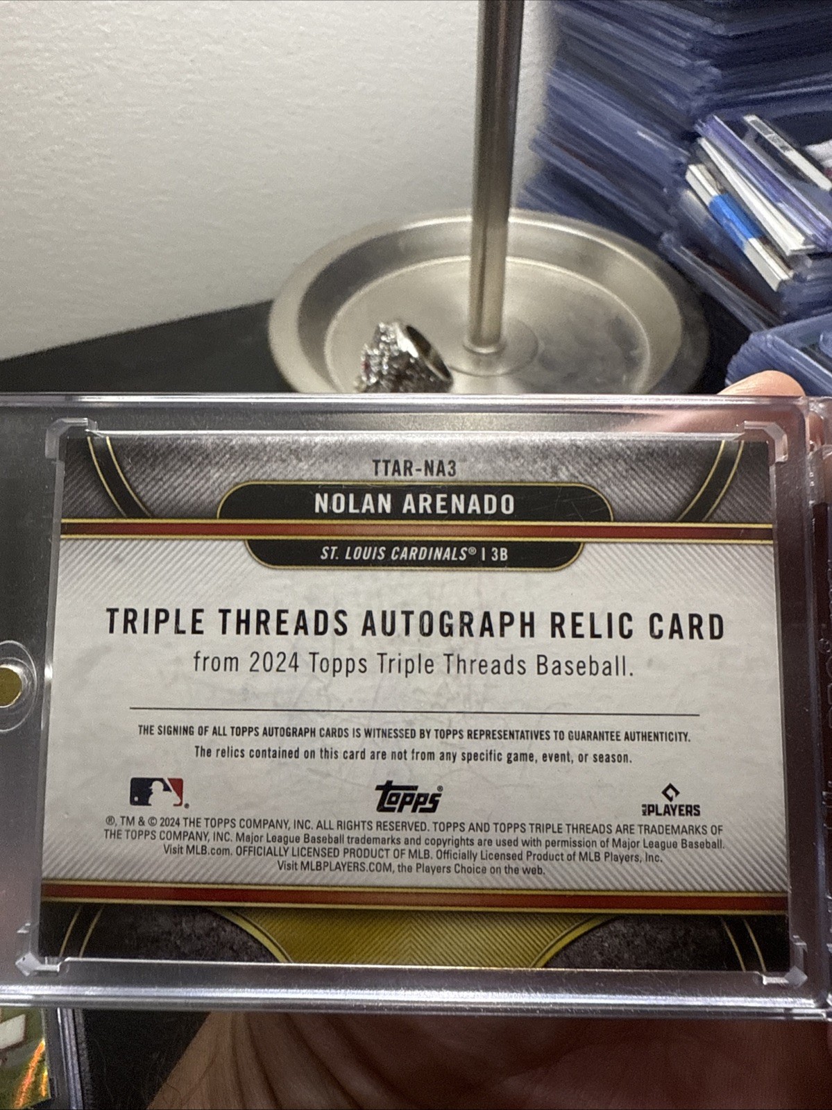The 2024 Topps Triple Threads Nolan Arenado Autograph Relic #TTAR-NA3 Emerald /18 is a highly sought-after sports trading card featuring a rare autograph and memorabilia piece from the Major League Baseball player Nolan Arenado. This card, part of the Triple Threads Relics insert set, is limited to a print run of only 18 and is serial numbered for authenticity. Manufactured by Topps, this card is a valuable addition to any baseball card collection, especially for fans of the St. Louis Cardinals and collectors of limited edition sports memorabilia.