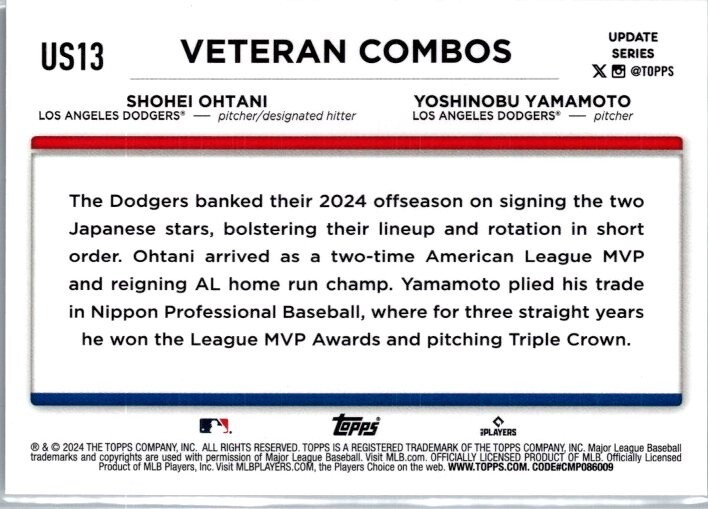 Experience the excitement of the diamond with the 2024 Topps Update Series OHTANI, YAMAMOTO #US13 Veteran Combos card, celebrating the dynamic duo from the Los Angeles Dodgers. This card captures the synergy of Shohei Ohtani and Yoshinobu Yamamoto, two of MLB's rising stars, in a stunning base set piece that's a must-have for any baseball aficionado or card collector. Crafted with the quality that Topps is known for, this card is part of the highly sought-after 2024 season release and features the classic [Base] parallel/variety. Dive into the nostalgia and passion of America's favorite pastime with this timeless collectible, a tribute to the players and the sport they love.