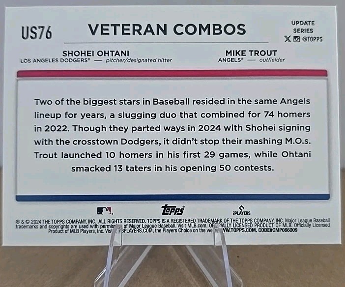 The product is a 2024 Topps Update Series trading card featuring Major League Baseball players Shohei Ohtani and Mike Trout. This card, numbered US76, is part of the "Veteran Combos" set and is manufactured by Topps. It is a Silver Crackle Foil parallel variety, making it a unique and collectible piece for fans and collectors alike. The card showcases both players from their respective teams, the Los Angeles Dodgers and Los Angeles Angels, making it a valuable addition to any baseball card collection.