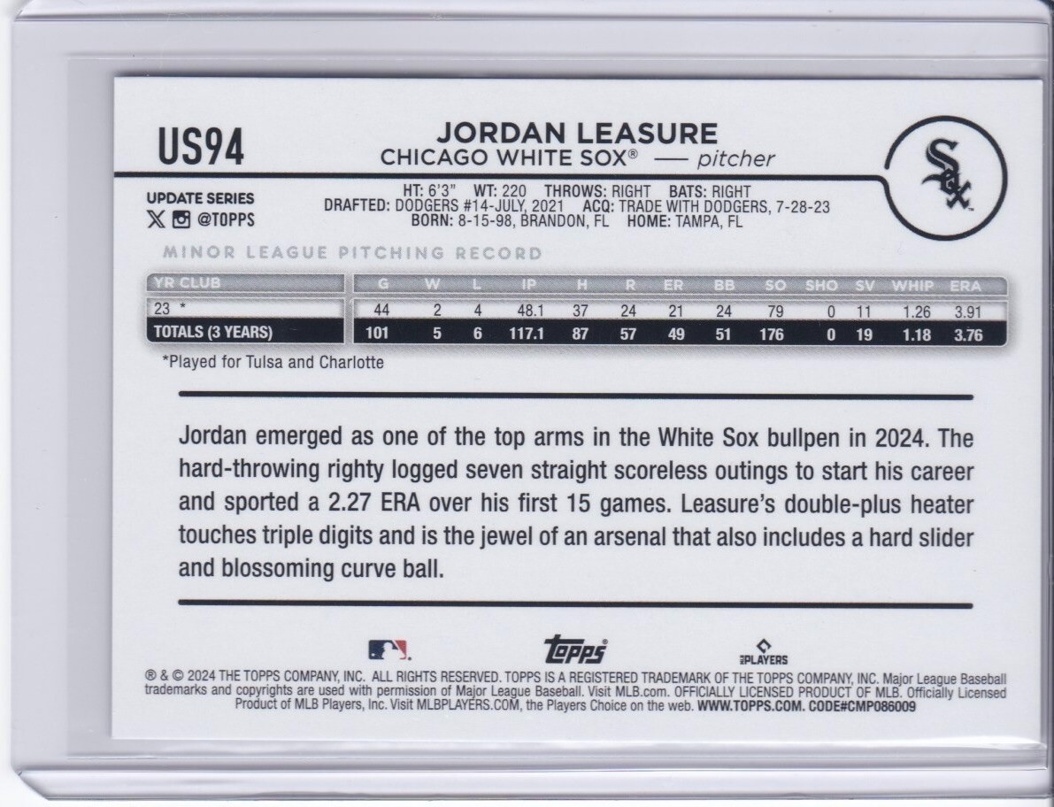 Elevate your baseball card collection with the 2024 Topps Update Series silver patterned #US94 featuring the promising talent, Jordan Leasure, of the Chicago White Sox. This limited edition card is part of a special silver Crackle Foilboard parallel variety, adding a unique and desirable touch to this collectible. It comes with the prestige of the Topps Update Series and includes features like the base set, rookie status, and serial numbering, making it a standout addition for collectors and fans alike.