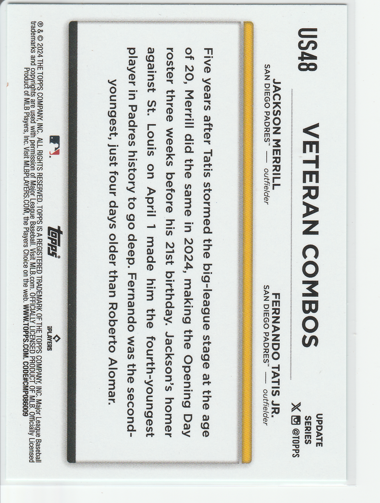 2024 Topps Update Series - Veteran Combos Fernando Tatís Jr., Jackson Merrill #US48 Aqua (RC) Items are considered excellent condition unless otherwise noted. No grading guarantees made on raw cards. Please see scans for condition. Additional photos available upon request. Excellent condition cards have clearly visible signs of wear. These cards have rough edges, moderate chipping, minor discoloration, minor indentation, fuzzy corners, or noticeable scratches.