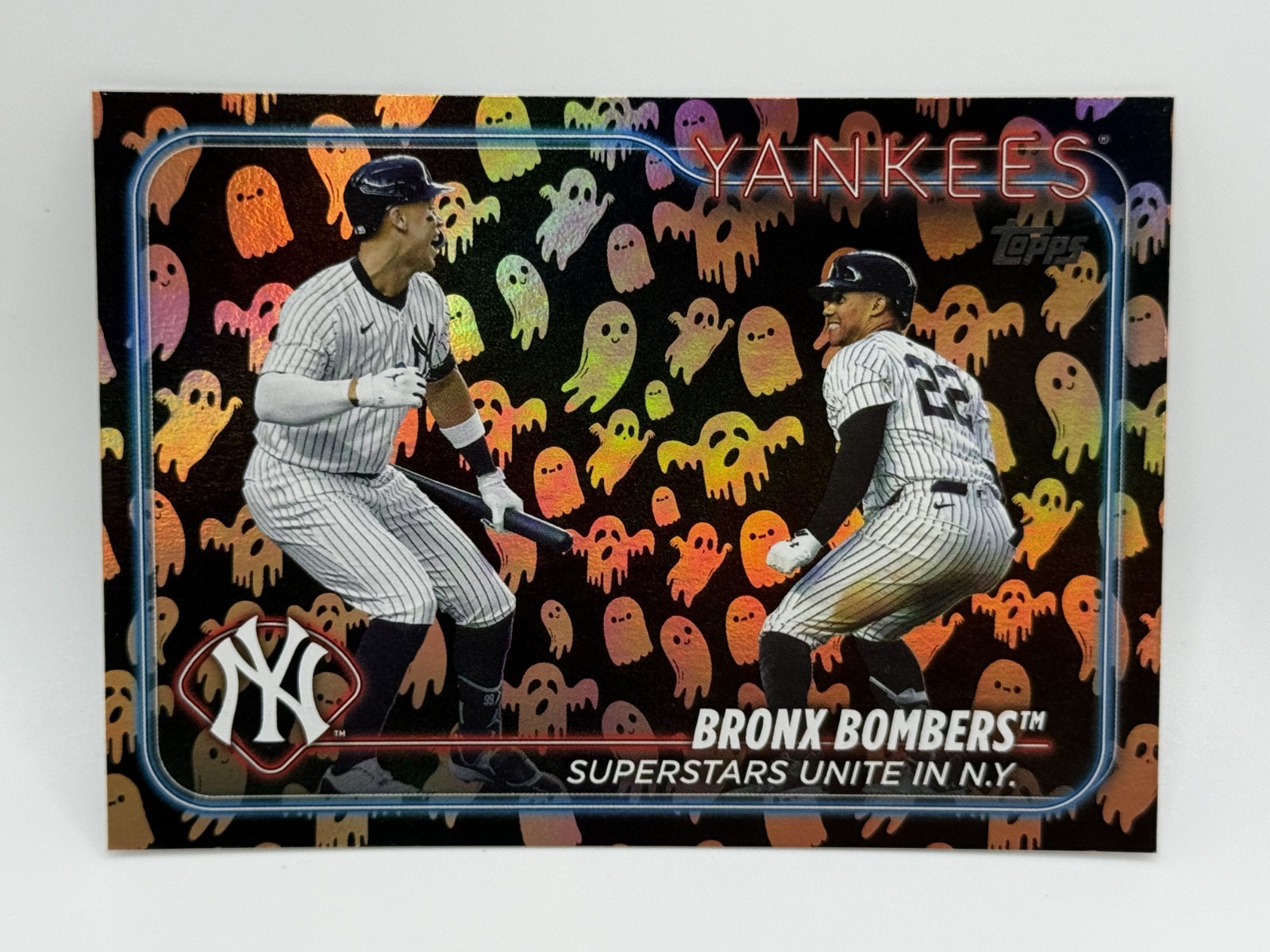 Series:Topps Update SeriesAdditional Description:Veteran Combos - Bronx Bombers (Superstars United in N.Y.)League:Major League Baseball (MLB)Team:New York Yankeesbrand:ToppsPlayer/Athlete:Aaron Judge, Juan SotoSeason:2024Subset:Veteran CombosSport:BaseballManufacturer:ToppsFeatures:Base Set, Parallel/VarietyCard Number:US181Parallel/Variety:Ghost FoilSet:2024 Topps Update Series