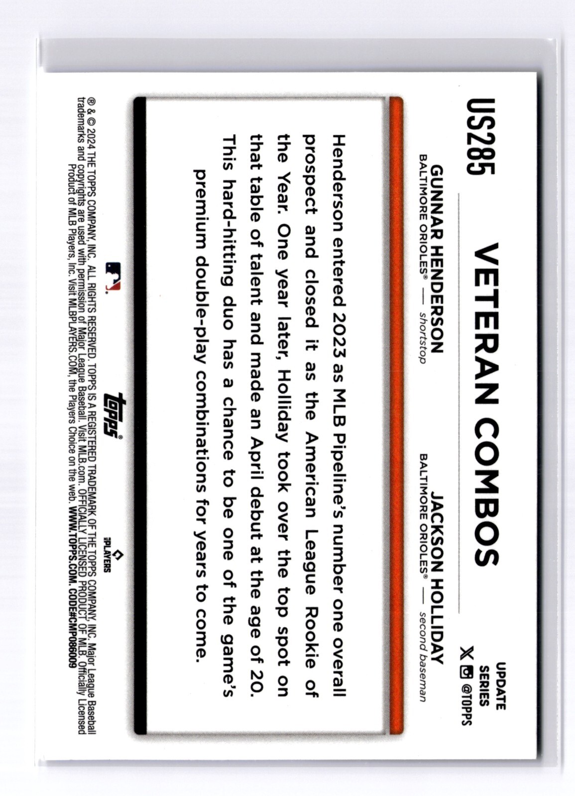2024 Topps Update Series Veteran Combos Jackson Holliday Gunnar Henderson US Card