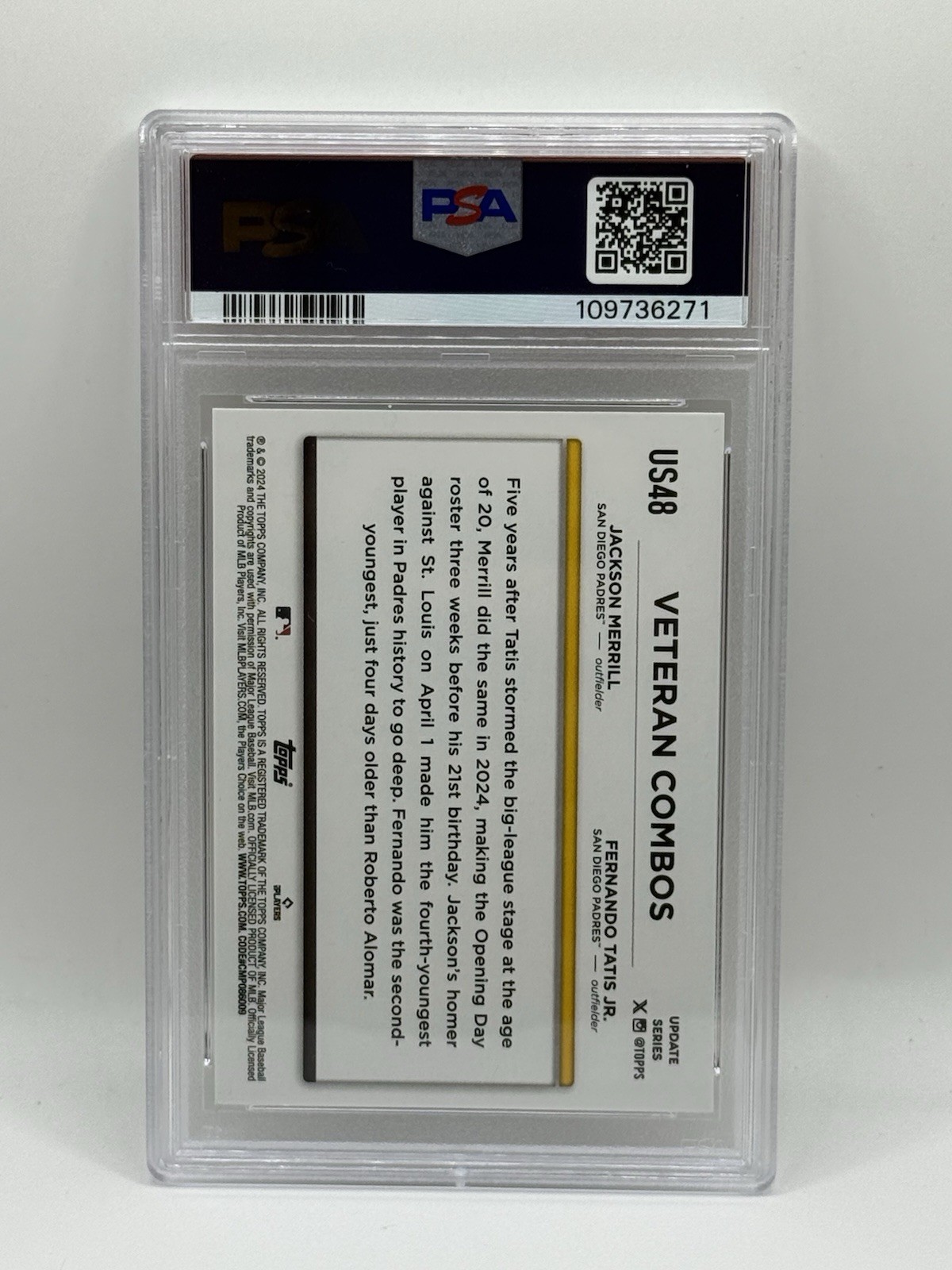The 2024 Topps Update Series trading card featuring Veteran Combos with Fernando Tatís Jr. and Jackson Merrill is a must-have for baseball fans and card collectors. Manufactured by Topps and part of the Major League Baseball (MLB) league, this card is a part of the base set for the 2024 season. The card highlights two promising players from the San Diego Padres, making it a valuable addition to any trading card collection. With the card number US48, this card captures the essence of baseball's rising stars.