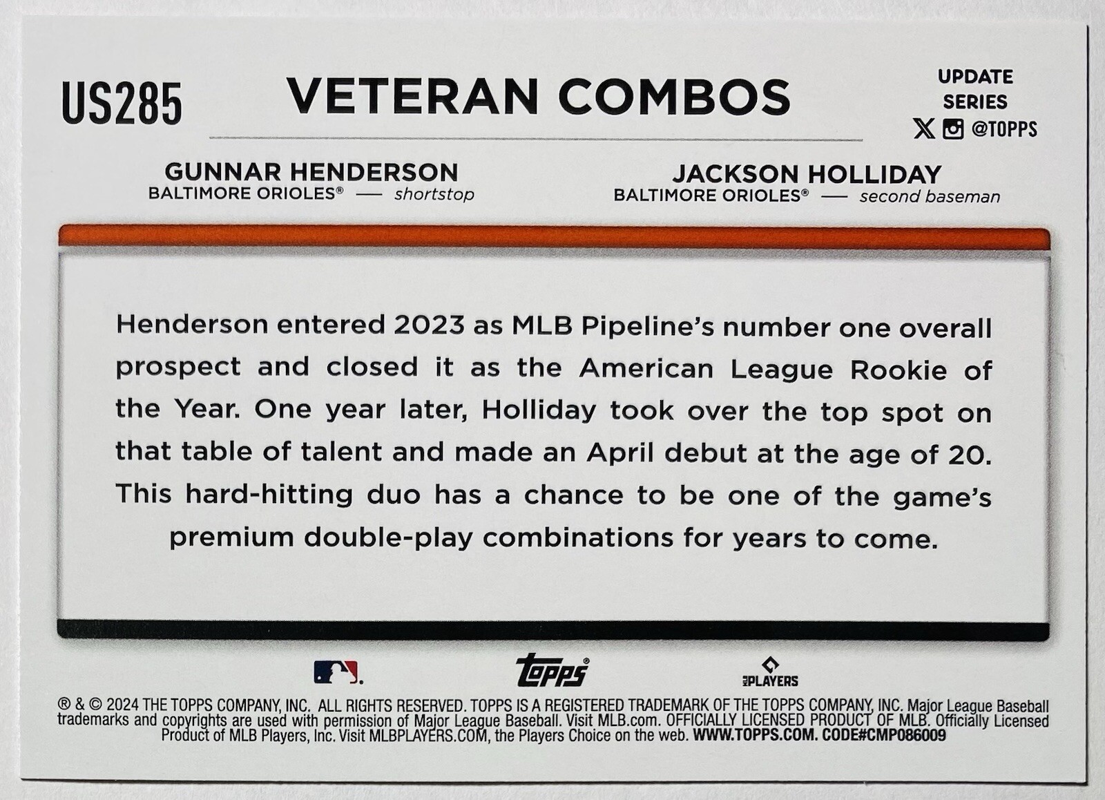 2024 Topps Update Soaring Confidence Gunnar Henderson/Jackson Holliday #US285. ***PLEASE READ CAREFULLY*** PLEASE CAREFULLY INSPECT ALL POSTED PICTURES FOR ANY NOTICEABLE ISSUES! ODRERS $20 AND UNDER ARE SHIPPED FREE WITH ESE (EBAY STANDARD ENVELOPE) PROGRAM AND ARE SHIPPED IN A PWE (PLAIN WHITE ENVELOPE) TRACKING INFORMATION MAY HAVE A LIMITED AMOUNT OF UPDATES. ORDERS OVER $20 WILL BE SHIPPED IN A BUBBLE MAILER WITH USPS GROUND ADVANTAGE FOR $4.99. CARDS UNDER $20 THAT ARE OVER 75pt. THICKNESS WILL BE SHIPPED WITH USPS GROUND ADVANTAGE FOR $3.99. CARDS ARE SHIPPED IN A TOP LOADER OR A SEMI-RIGID CARD HOLDER LIKE A CARD SAVER 1 OR ULTRA PRO. THE POSTAL SERVICE (ESTIMATED) DELIVERY TIME FOR ESE (EBAY STANDARD ENVELOPE) IS 3-6 (BUSINESS) DAYS ON (AVERAGE). HOWEVER HOLIDAYS AND SEVERE WEATHER ISSUES MAY CAUSE DELAYS WITH YOUR SHIPMENT. PLEASE BE PATIENT IN THESE CIRCUMSTANCES. APPROXIMATELY 95% OF ALL CARDS ARE IN NEAR MINT OR BETTER CONDITION WHILE ABOUT 5% ARE IN EXCELLENT-NEAR MINT CONDITION. PLEASE BE ADVISED THAT A SMALL NUMBER OF CHROME CARDS SUCH AS PRIZM, OPTIC, MOSAIC, SELECT, BOWMAN, TOPPS CHROME AND OTHER CHROME PRODUCTS MAY HAVE FACTORY ISSUES SUCH AS PRINT LINES OR MINOR SURFACE IMPERFECTIONS. CARDS ARE SHIPPED THE NEXT DAY MONDAY-FRIDAY ONLY. PLEASE, FEEL FREE TO SEND AN OFFER. ALL OFFERS WILL BE CONSIDERED! NEW CARDS ARE ADDED DAILY, PLEASE CHECK BACK FOR STORE WIDE SALES AND CONSIDER ADDING ME TO YOUR SAVED SELLER’S LIST! IF YOU HAVE ANY QUESTIONS OR CONCERNS ABOUT A SHIPMENT OR A SPECIFIC LISTING PLEASE CONTACT ME THROUGH EBAY’S MESSAGING SYSTEM.