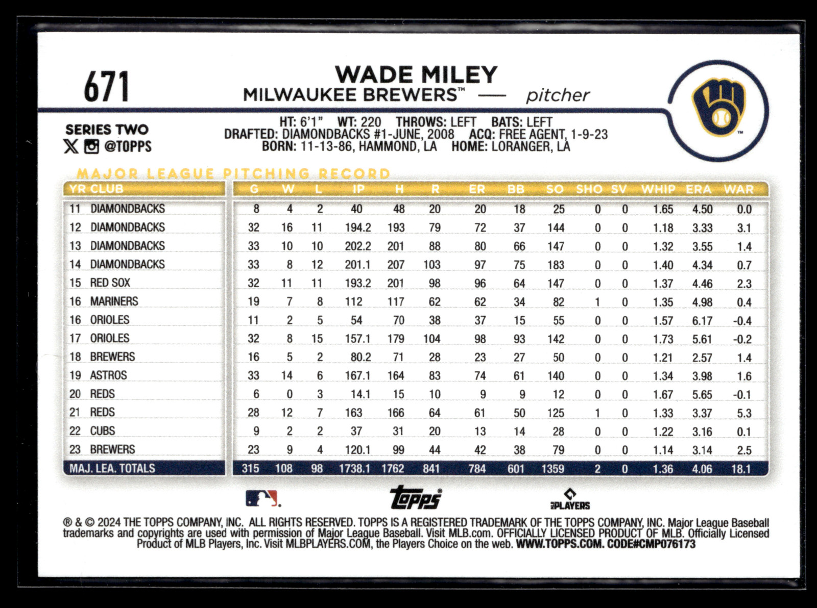 The Card pictured is the card you will receive unless there are multiple quantities then you will receive a card in the comparable grade. Cards in poor condition could have creasing, stains, rounded corners, pen marks or a combo of them. please see pics for a better understanding of cards condition. Excellent Milwaukee Brewers Royal Blue Wade Miley #671 2024 Topps Topps 2024 Baseball .