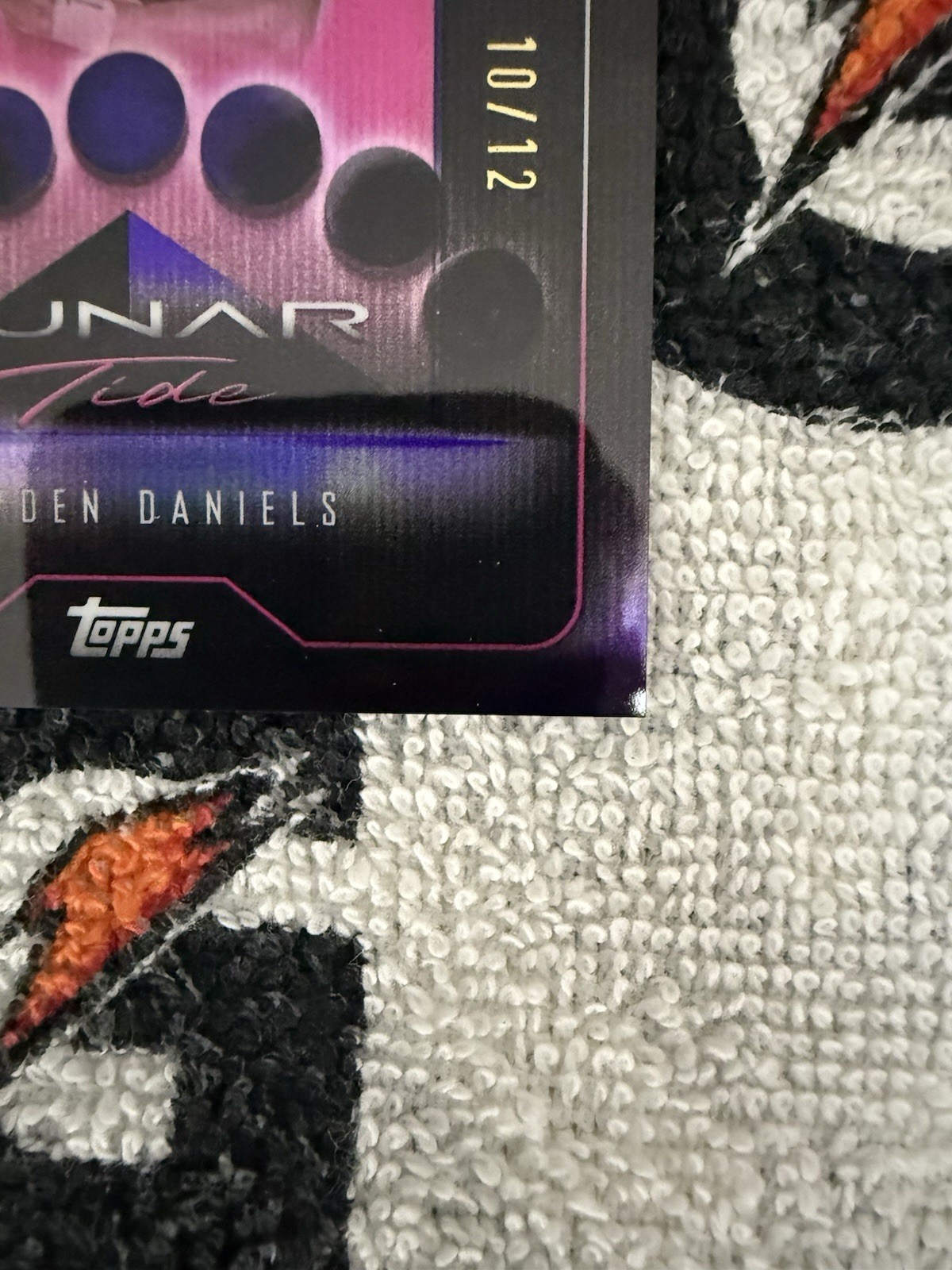 The product is a 2024 Topps football trading card featuring Jayden Daniels of the Washington Commanders. This particular card is from the Midnight set, featuring a lunar tide design and a refractor parallel variety. Manufactured by Topps, it is an original card made of card stock with a thickness of 20 Pt. The card is 10/12 and is in near mint or better condition. This collectible item is part of the National Football League (NFL) and is a must-have for fans and collectors alike.