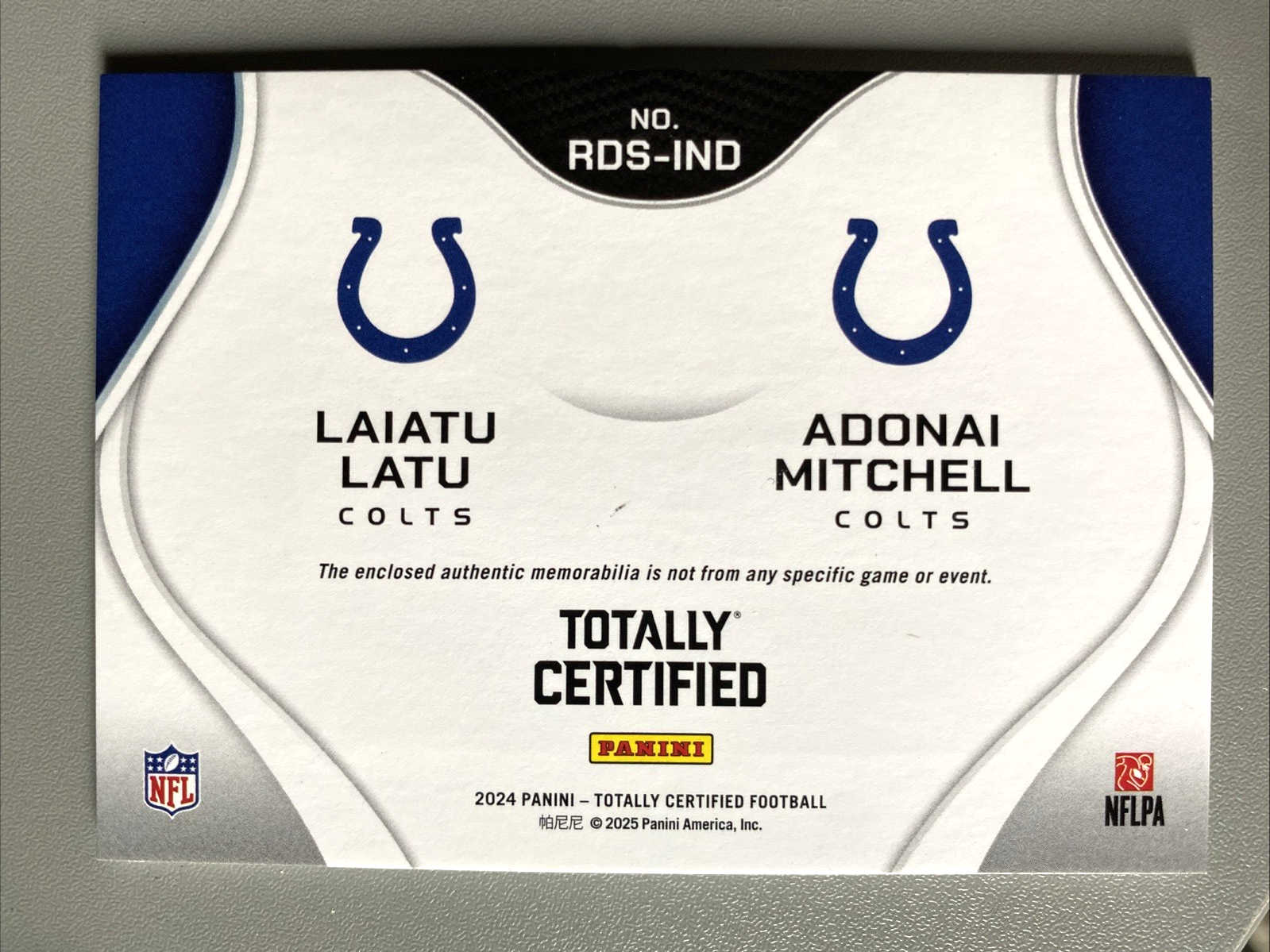 The product is a 2024 Totally Certified #RDS-IND Laiatu Latu, Adonai Mitchell (RC) Dual-Patch sports trading card featuring the players from the Indianapolis Colts. Manufactured by Panini, this original card is made of card stock and includes a patch from the National Football League (NFL) set. The card showcases a rookie player, Adonai Mitchell, with memorabilia from the Super Bowl event. While it is not autographed, the card is authenticated by Panini Authentic, making it a valuable addition to any football card collection.
