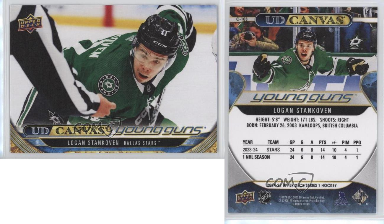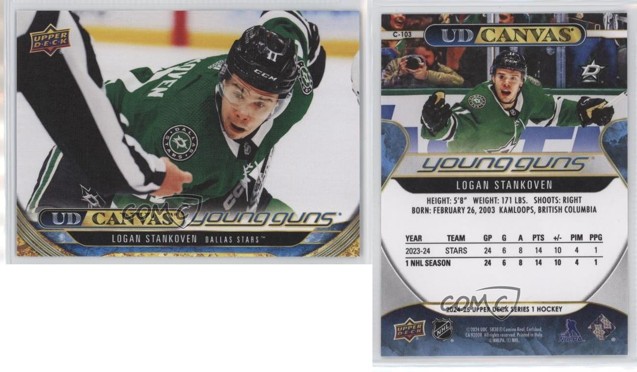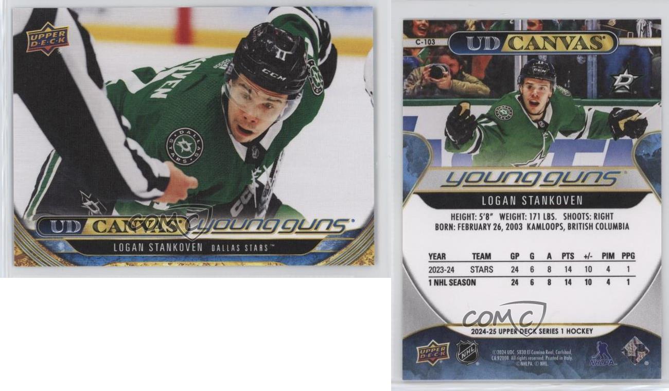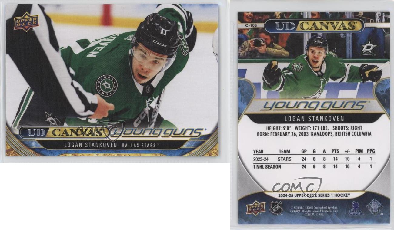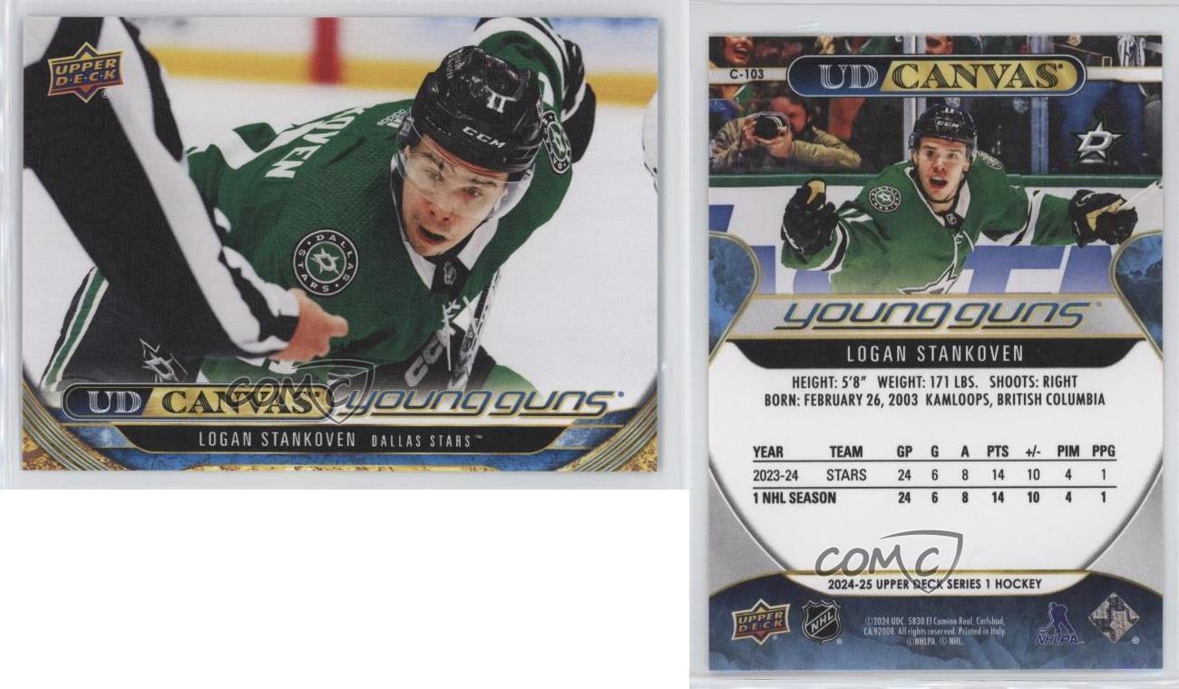 2024-25 Upper Deck Series 1 - UD Canvas #C-103 Young Guns - Logan Stankoven - Rookie - Ice Hockey Card - Featuring the Dallas Stars - Featuring Logan Stankoven Search for more: 2024-25 Upper Deck Series 1 Search for more: 2024-25 Upper Deck Series 1 - UD Canvas View all of our Listings Auctions Buy It Now About Us Located in the beautiful Pacific Northwest, COMC (Check Out My Cards) is the world's largest consignment service for trading card singles. More than 10,000 people have used our consignment service to list over 50 million trading cards. Find out how we can help you consign your items on eBay by contacting us through eBay messaging. COMC -- "The Safe & Easy Way to Buy & Sell" Representative Image - Select Specific Item above to see image of actual item Representative Image - Select Specific Item above to see image of actual item Raw Condition for Modern Cards Unless otherwise noted, raw modern cards are listed in Near Mint-Mint condition or better. A NM-MT card appears to be Mint at first glance, but upon closer inspection, may exhibit some of the following: minor print defects (e.g. roller marks, print line, dimple), minor scratches, slight edge wear, and slight corner wear. Centering is clearly visible in the images provided and does not factor into our condition assessment. Raw Condition for Vintage Cards Unless otherwise noted, raw vintage cards are listed in Excellent condition or better. An EX card may exhibit some of the following: minor rounding of corners, surface wear, print defects, light scratches, and slight edge wear/chipping. Centering is clearly visible in the images provided and does not factor into our condition assessment. Domestic Shipping Combined shipping for multiple items is available. To receive combined shipping, please ensure all desired items are in your eBay shopping cart before proceeding to checkout. eBay limits orders to 40 items per order. We automatically combine multiple orders placed on the same day. If you place multiple orders on the same day, please contact us to request a refund of applicable shipping costs. Signature confirmation may be required on invoices over $400. All cards are protected and shipped securely. International Shipping COMC offers eBay's International Shipping (EIS) for international orders under $2,500* (see country exceptions below). All duties and import fees are paid at checkout; in the rare event that there are additional import fees upon delivery, these are borne by the buyer. EIS packages route through a shipping hub in Erlanger, KY before shipping to their final destination. Please note that EIS does not allow for combined shipments. The shipping rates are determined by eBay and cannot be adjusted. *Maximum sale price exceptions: Colombia, Kuwait ($2,000); Taiwan ($1,539); Chile, Costa Rica, Guatemala, Honduras, Trinidad and Tobago ($1,000); Antigua and Barbuda, Aruba, Belize, Dominica, Grenada, Philippines, Saint Kitts and Nevis, Saint Lucia, Montserrat, Turks and Caicos Islands ($500); Dominican Republic, El Salvador ($200). Please request a shipping quote through eBay messaging for orders that exceed the maximum sale price supported by eBay's International Shipping. You will be responsible for all duties and import fees for international orders shipped outside the EIS. All cards are protected and shipped securely. Payment COMC does not accept offers on our cards through our eBay storefront. COMC utilizes eBay’s managed payments system. If you are experiencing difficulties making a payment, please contact eBay for assistance. Return Policy Returns are only accepted on the rare occasion the item is not as described. If you are making a return, please initiate the return process through eBay so a mailing label can be provided for you. Prior to listing, our expert team carefully assessed this item to represent it accurately. Please review the description and high-definition images prior to purchasing to ensure this item meets your satisfaction. We welcome you to contact us if you have further questions about this item. Trust and Integrity COMC carefully assesses each item consigned to us to prevent fraudulent items from entering the marketplace. If you believe an item offered on COMC may be fraudulent, please contact us with details so we can investigate the issue. Items we determine are outside our supported items policy may be removed. Last Modified: 6/23/2025 9:29:55 AM PDT