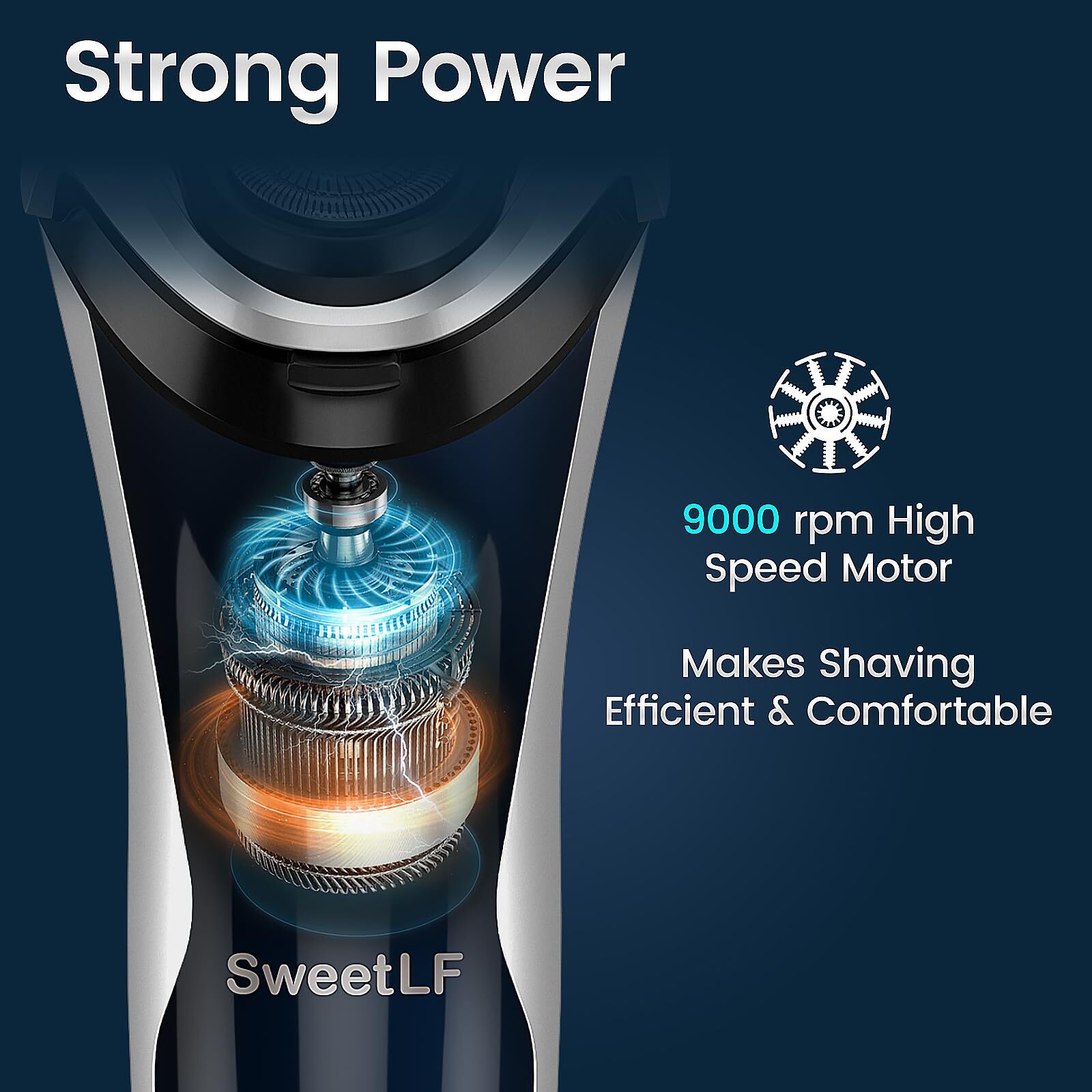 đă3D FLOATING SHAVER HEADă- The electric shaver adopts precision blade technology, high-speed motor, The flexible head rotates 360° to fit any curve of your face, neck or jaw. The 9000 rpm motor gives you a close, deep shave, minimizing pressure and irritation for a smooth, close shave. đăSMOOTH AND CLOSE SHAVE ă- With 3-direction floating heads, the 3D rotary shaver automatically adapts to the contours of the face, neck and jaw, and provides a comfortable and close shave anytime.The more you use it, the better it can adapt to the face đăIPX7 WATERPROOFă- The whole body of the electric razor is IPX7 waterproof,.Enjoy your dry shaving when sitting on sofa, or do a refreshing and comfortable shaving in shower. The rotary shaver easily adapts to either shaving foam or gel for a smoothier and closer shaving experience.Plus, this electric shaver can be washed directly by water. đăPOP-UP TRIMMER & ONE TOUCH OPENă- convenient Pop-Up trimmer is perfect for grooming beards and trimming sideburns. If your beard or other facial hair is too long, it is recommended to use this trimmer before shaving with acordless razor. đăCONVENIENT TYPE-C CHARGINGă- TYPE-C power port is compatible with all standard 5V USB power adapters, convenient for your daily and travel use. This rotary shaver includes a USB charging cable.Enjoy about 120 minutes shaving time (approximately 30 full shaves) with 1 hour full charge. đăPACKAGE LISTă- 1 x Electric Shaver/Electric Razor,1 x USB Cable (NO USB adapter),1 x Charging Cable, 1 x User Manual