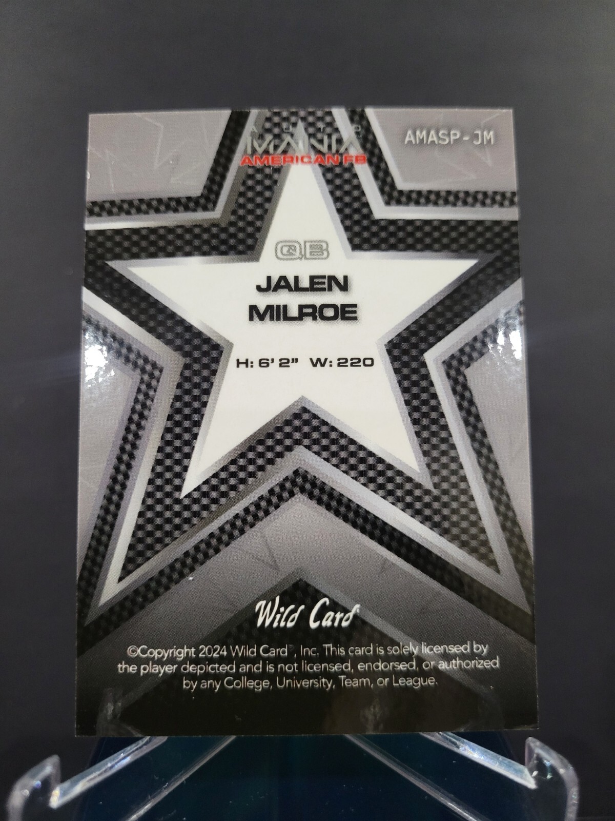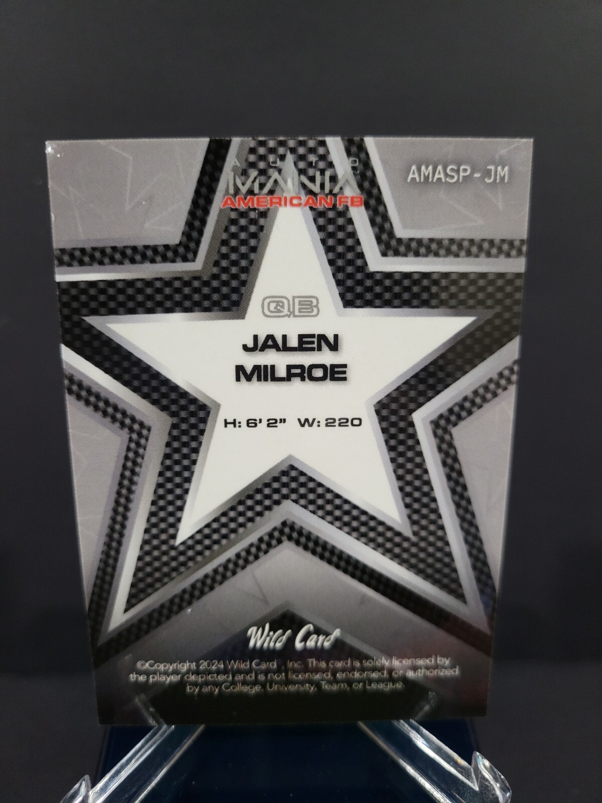 This 2024 Wild Card American Flag Spirals trading card features Jalen Milroe of the Alabama Crimson Tide football team. The card is near mint or better and is ungraded. It is a sports trading card with a print run of 25 and is serial numbered and parallel/variety. The card is part of the National Collegiate Athletic Association (NCAA) League and is manufactured by Wild Card. It is a great addition to any sports trading card collection.