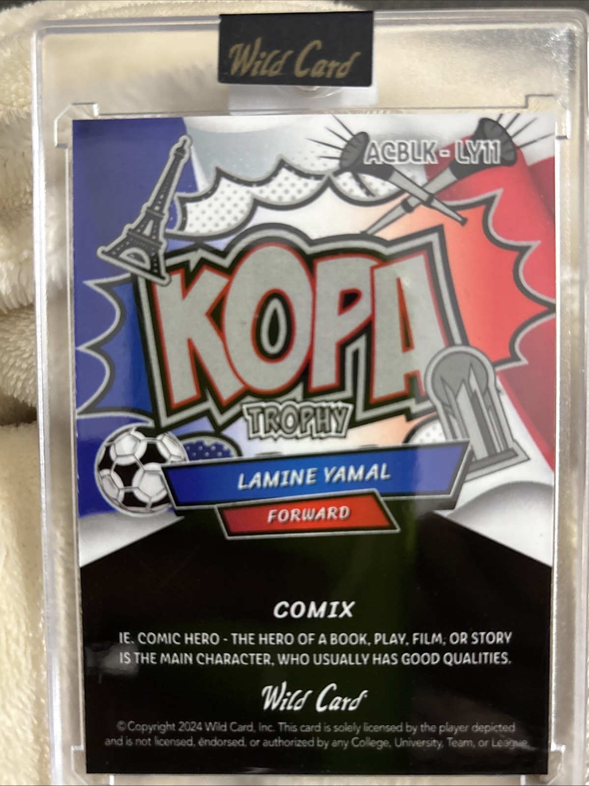 The 2024 Wild Card COMIX trading card featuring rookie player Lamine Yamal is a rare 1/1 print. This unique card is a collectible item for soccer fans and collectors alike, showcasing the talent of the up-and-coming athlete. With its exclusive design and limited availability, this card holds value for fans of the sport looking to add a special piece to their collection.