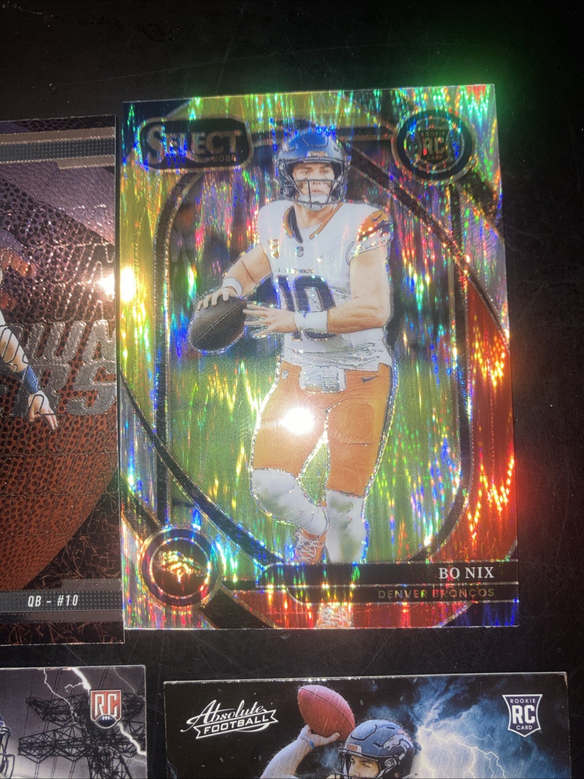 The product is a lot of 8 standard-sized 2024-2025 Bo Nix rookie trading cards featuring the Denver Broncos quarterback in the NFL. The cards are original and manufactured by Panini, known for their high-quality sports trading cards. Each card includes special features such as embossed designs, holograms, short prints, and exclusive inserts, making them a sought-after item for collectors and fans alike. These cards are part of a limited edition base set and are a must-have for any football enthusiast looking to add a piece of the action to their collection.