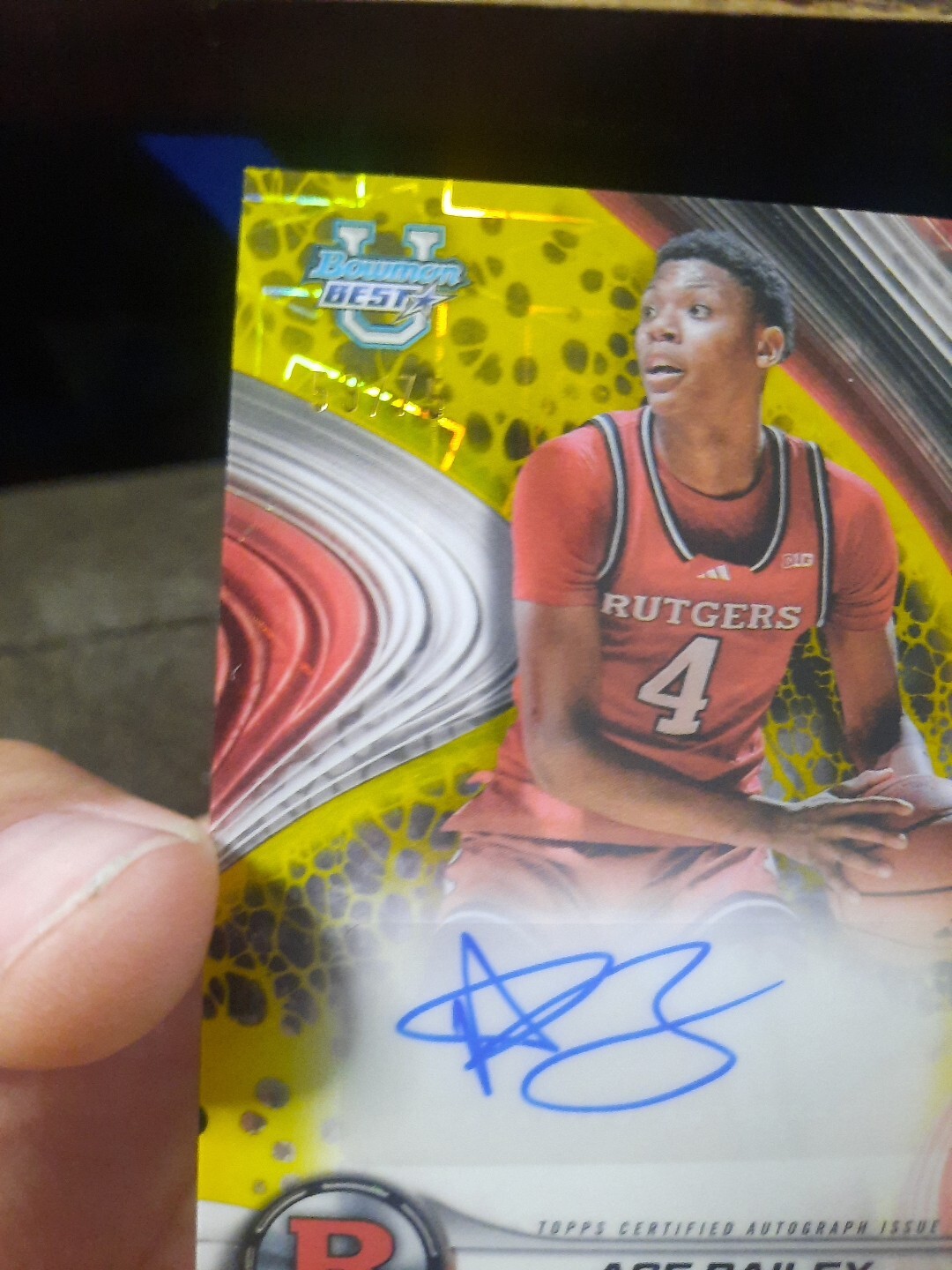 The product is a 2024-25 Bowman Best University Ace Bailey Yellow Lazer Refractor Auto trading card numbered 59/75. This autographed card features Ace Bailey from the Rutgers Scarlet Knights team of the National Collegiate Athletic Association (NCAA) league. Produced by Topps as an original release, this sports trading card includes features such as serial numbering, hologram, short print, and rookie designation. With a unique yellow lazer refractor parallel variety, this collectible item is a valuable addition to any basketball card collection.