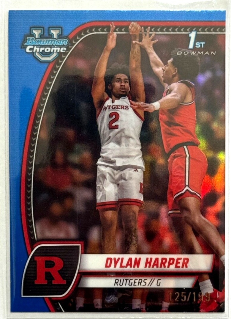 The 2024 1st Bowman University U Chrome #22 Dylan Harper Blue Refractor #76/199 trading card is a highly sought-after collectible for basketball enthusiasts. This card features a parallel blue refractor design, making it a rare find within the 2024-25 Bowman Chrome University set by Topps. With a serial number of 76 out of 199, this rookie card is a valuable addition to any sports trading card collection, especially for fans of the National Basketball Association (NBA) and NCAA Division I Basketball Mens.