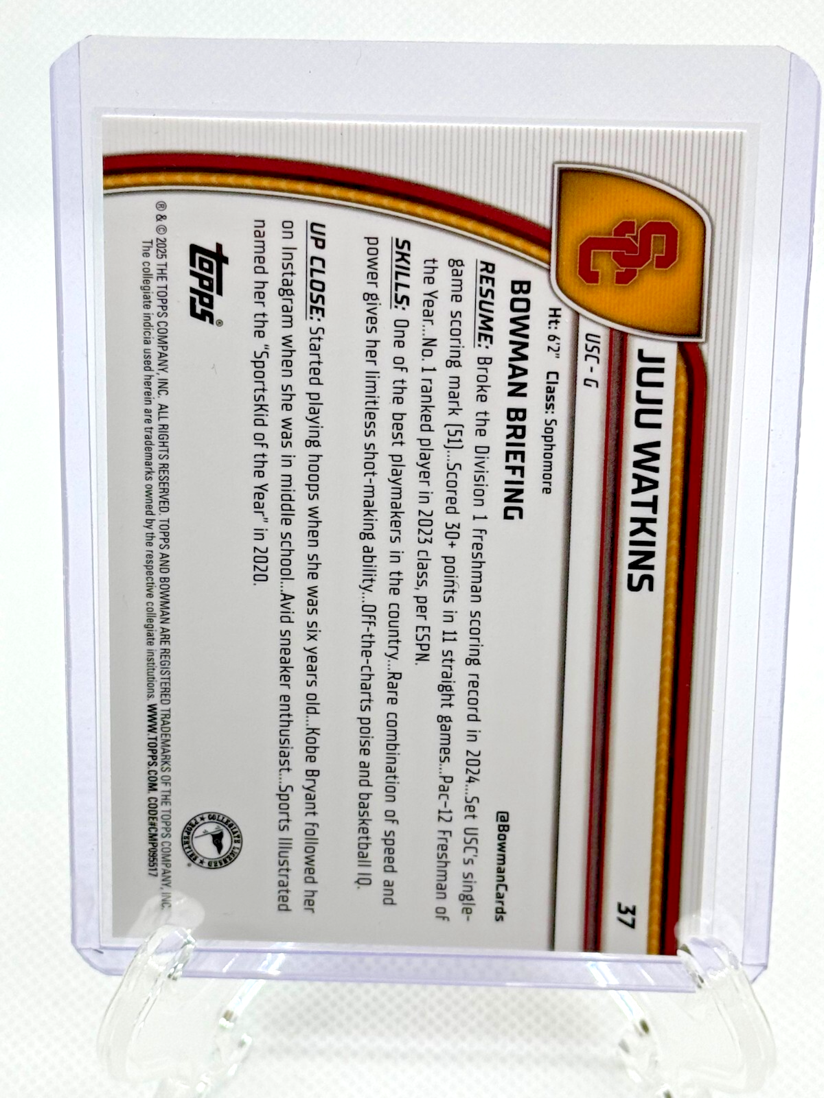 The product is a 2024-25 Bowman Chrome University of Southern California basketball trading card featuring JuJu Watkins in a purple parallel variety. This limited edition card is numbered out of 399 and part of the 2024 Bowman set by Bowman. As a collectible item for fans of the USC Trojans and basketball enthusiasts, this card captures a specific player and season, making it a desirable addition to any trading card collection.