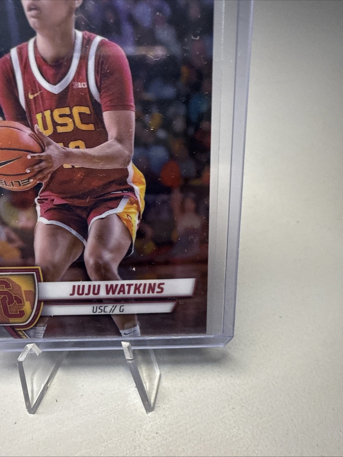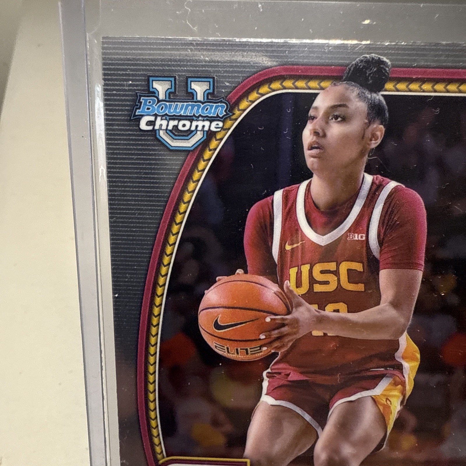 The product is a 2024-25 Bowman Chrome U trading card featuring JuJu Watkins of the USC Trojans. This basketball card is an original autographed rookie card, manufactured by Bowman. It is a standard-sized card made of card stock, and it belongs to the National Collegiate Athletic Association (NCAA) league. The card is part of the 2024-25 Bowman Chrome U set and showcases the player in his USC team gear.