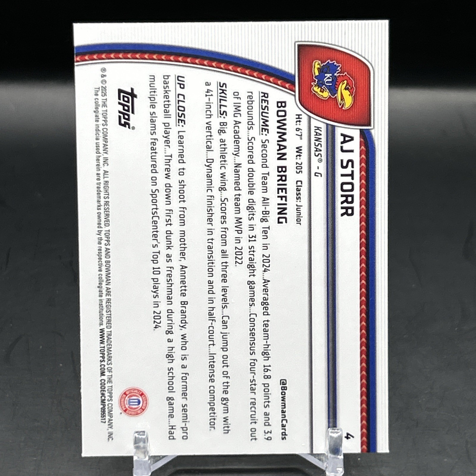 2024-25 Bowman Chrome University Basketball Green Shimmer 4 AJ Storr, Kansas. Condition is Ungraded. Shipped with eBay Standard Envelope for eligible items up to $20.