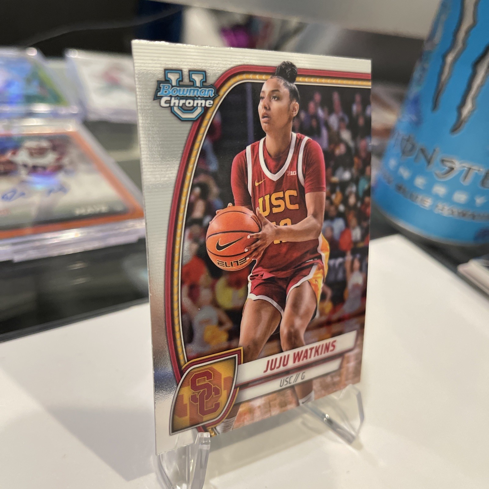 Elevate your collection with the 2024-25 Bowman University Chrome JuJu Watkins card, a must-have for basketball enthusiasts and collectors alike. Highlighting the talents of JuJu Watkins of the USC Trojans, this card is a shining gem from the Bowman U Chrome set, reflecting the energy and promise of collegiate basketball's finest. With card number 37, this sleek chrome variety captures the essence of the NCAA experience, minus the autograph, offering an authentic piece of sports memorabilia. It's an original print from the 2024 season, featuring the charismatic Copper Flagg character that fans and collectors have come to adore. Whether you're a die-hard basketball fan or a dedicated collector, this card is an exceptional find.
