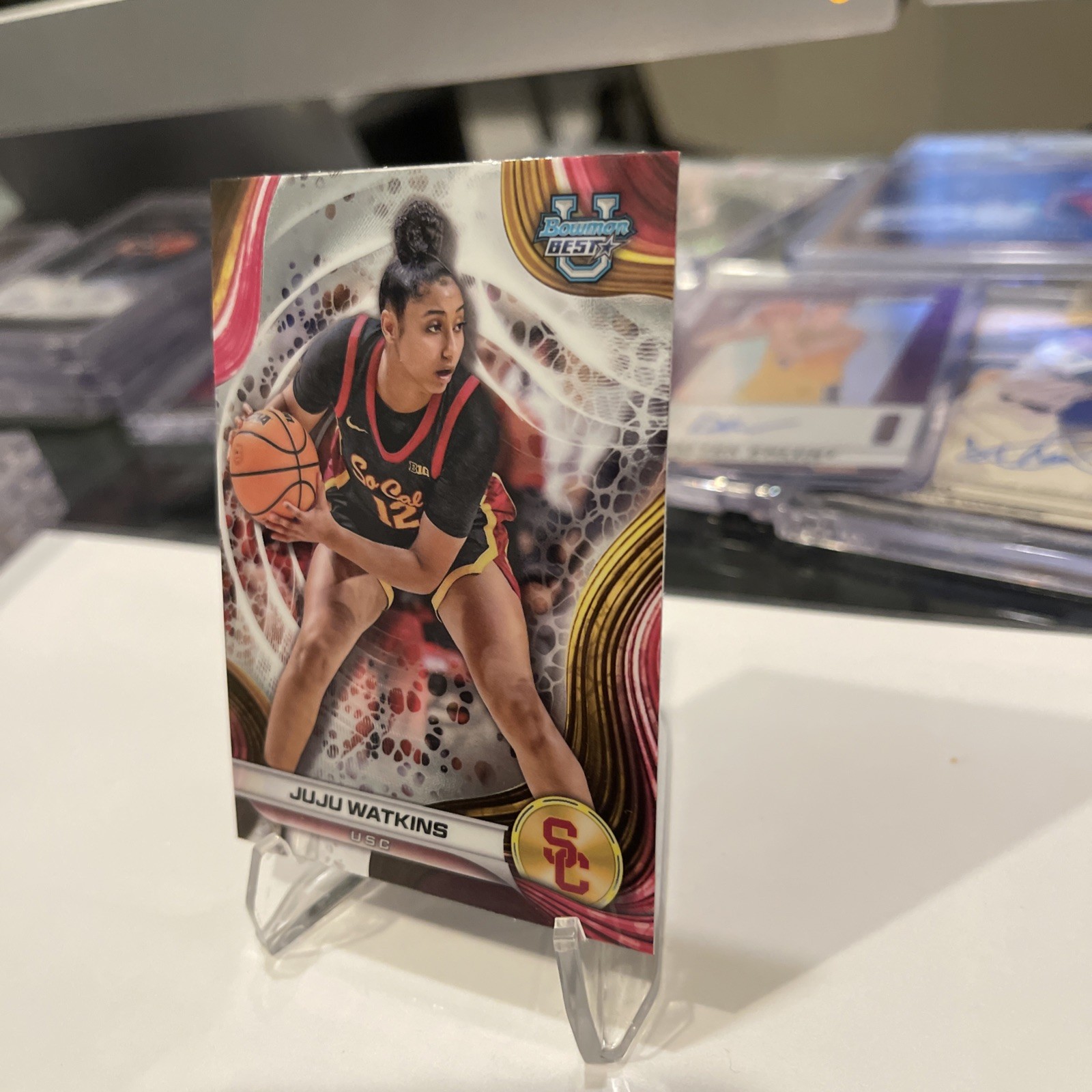 The product is a 2024-25 Bowman University Best JuJu Watkins True #37 trading card featuring the USC Trojans basketball player. This sports trading card is part of the 2024 Bowman set and belongs to the Chrome parallel/variety, making it a highly collectible item for fans of basketball memorabilia. The card showcases JuJu Watkins, a promising athlete in the Women's National Basketball Association (WNBA) and National Collegiate Athletic Association (NCAA), making it a valuable addition to any sports card collection.