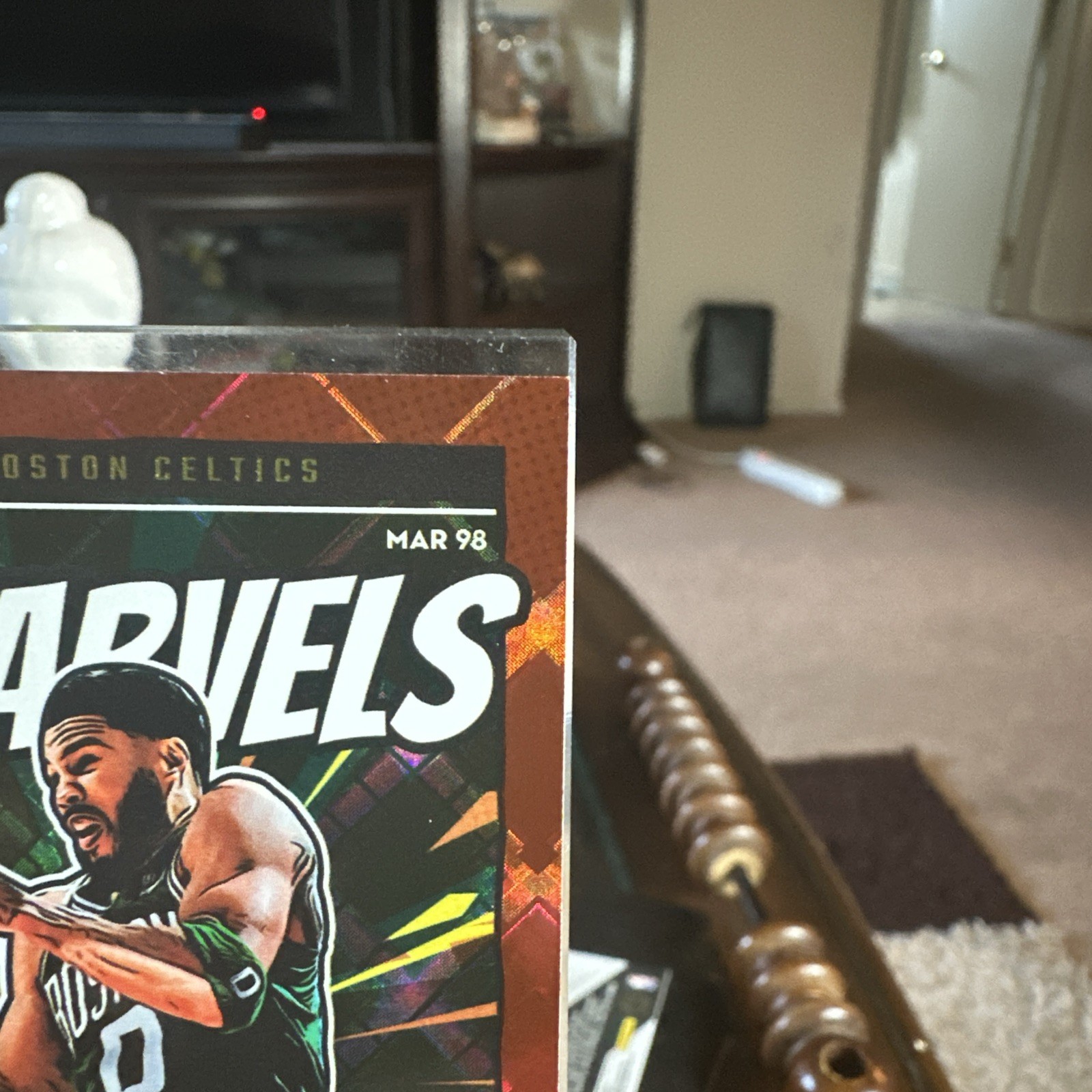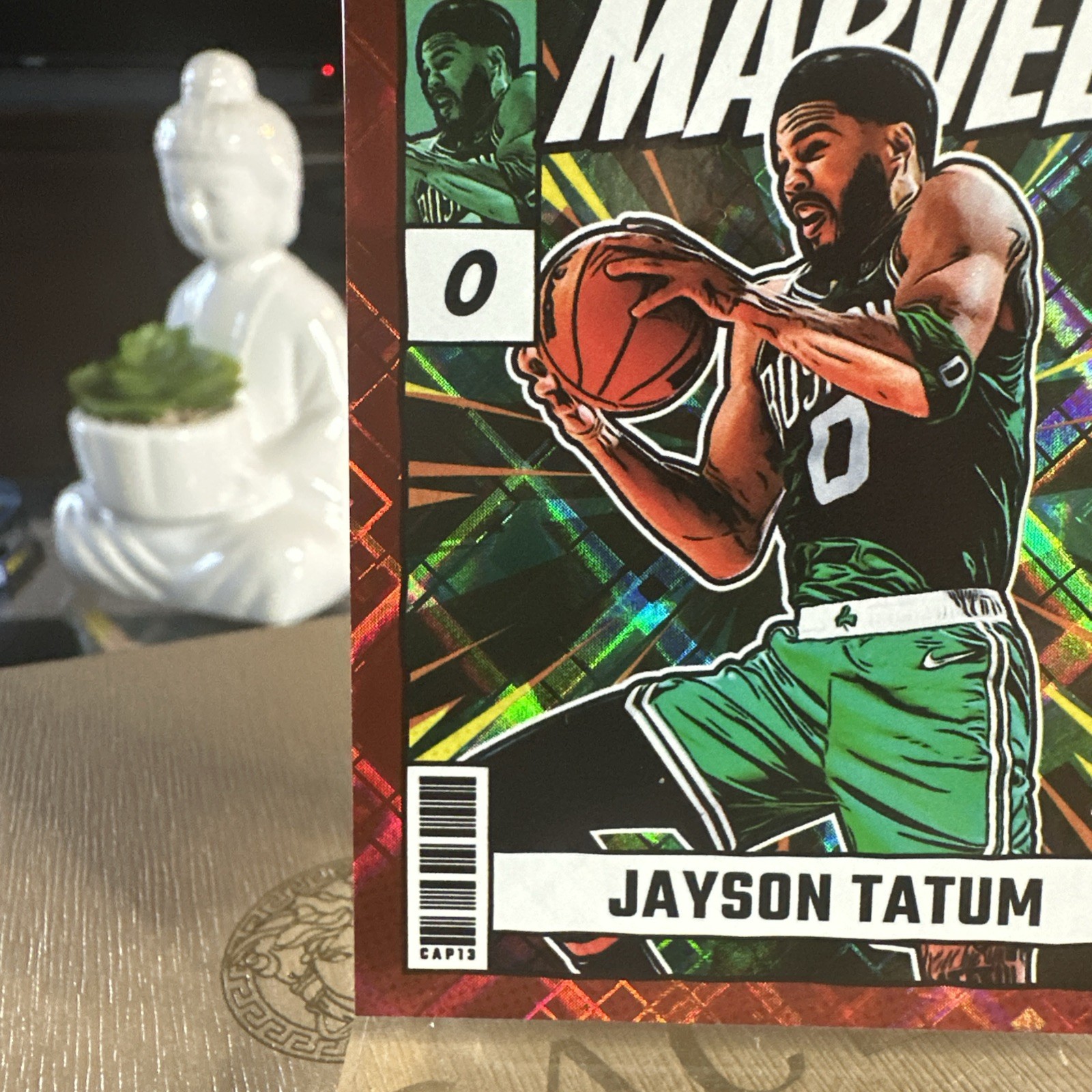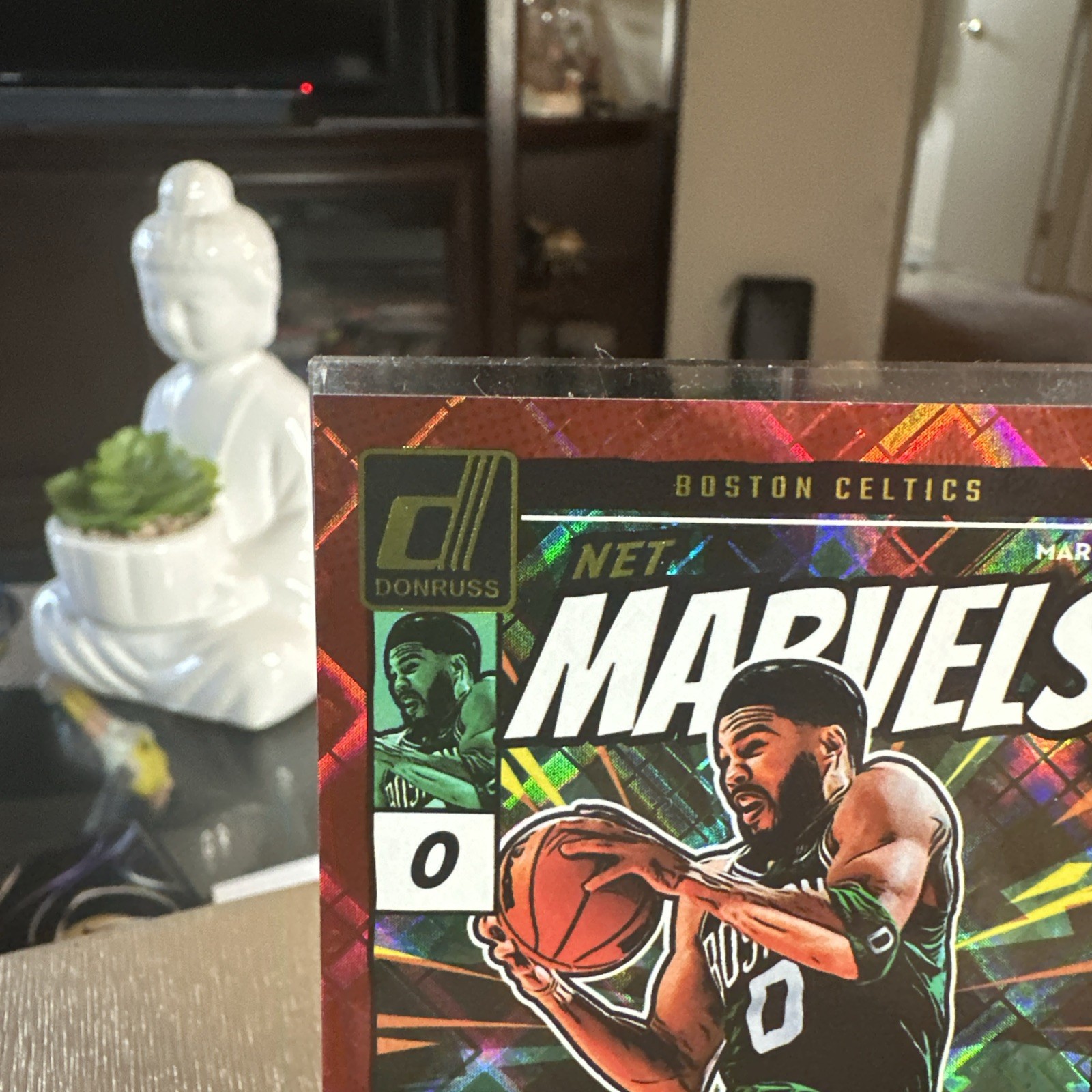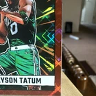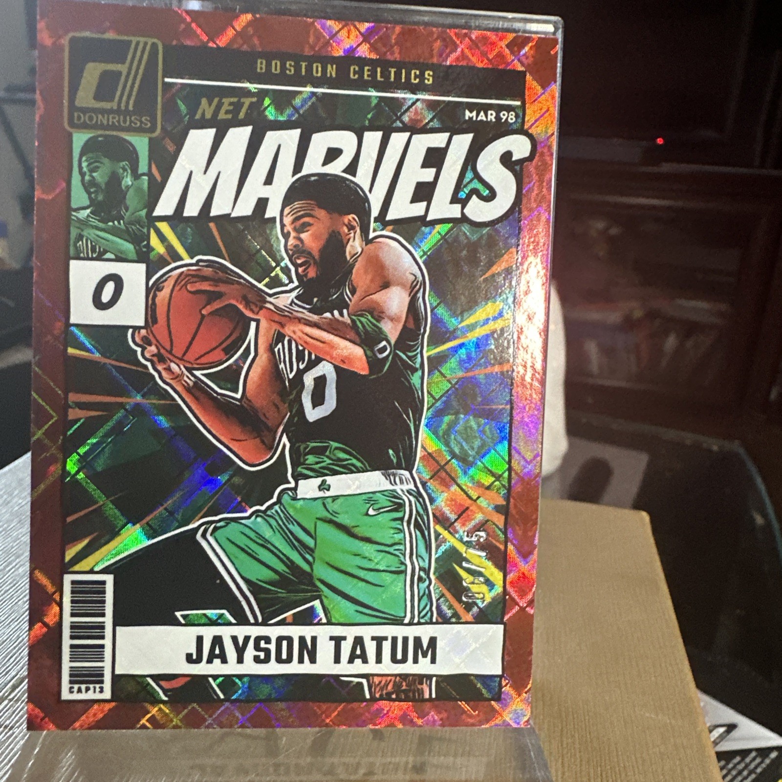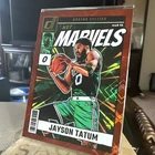 The product is a 2024-25 Panini Donruss Jayson Tatum #24 Net Marvels Red Diamond Prizm trading card limited to 75 copies. This basketball sports trading card features the player Jayson Tatum from the Boston Celtics in the National Basketball Association (NBA). Manufactured by Panini, this highly collectible card is part of the 2024 Panini Donruss set and is a rare Diamond parallel variety, making it a valuable addition to any sports card collection.
