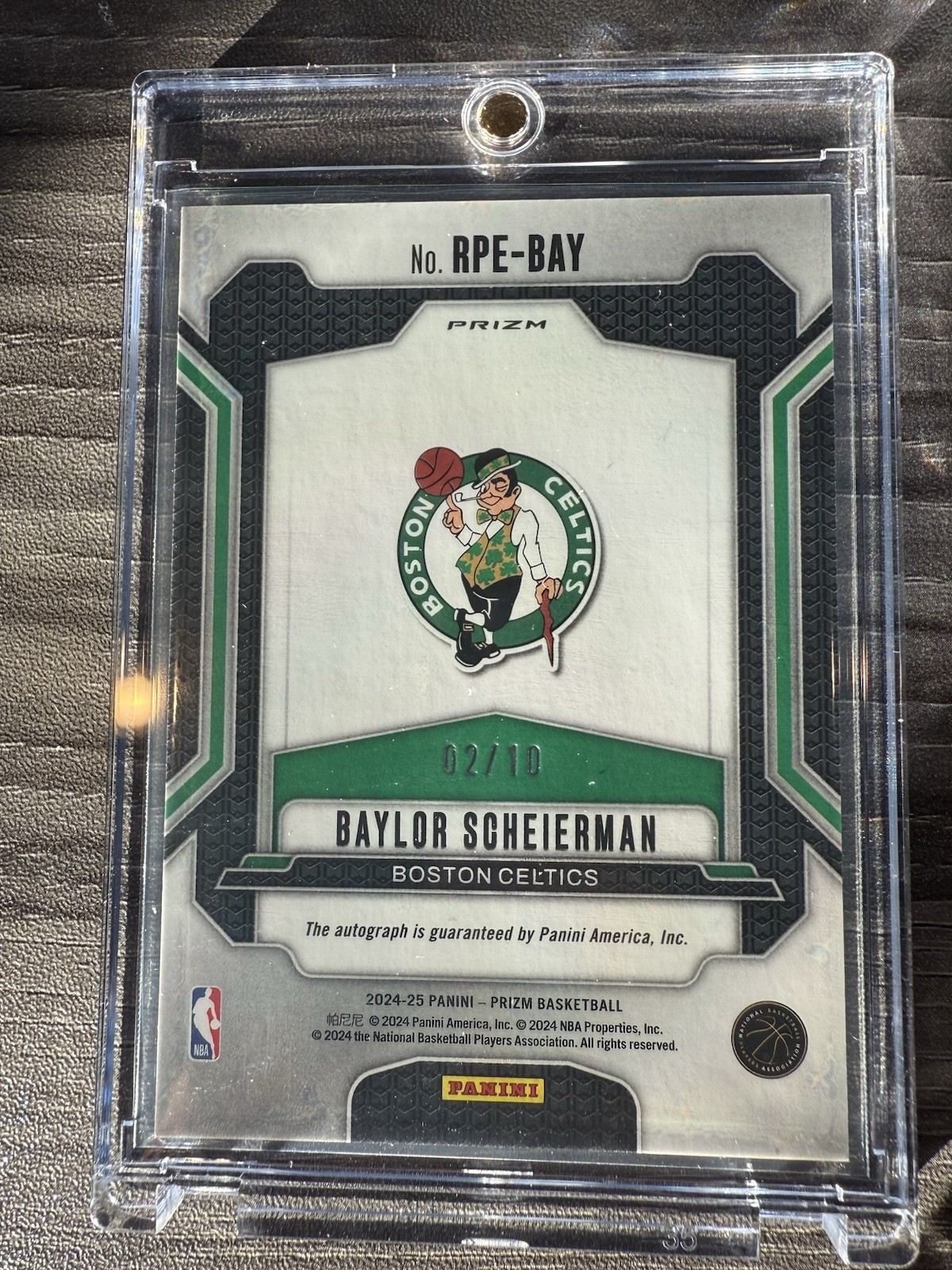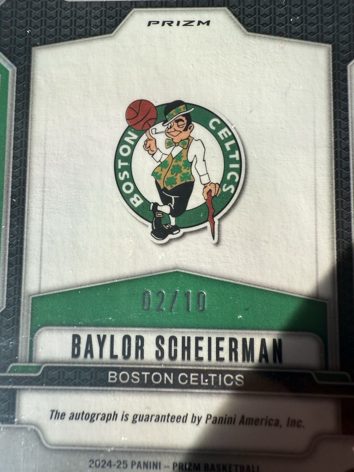 The product is a rare and highly sought-after 2024-25 Panini Prizm Baylor Scheierman Gold Rookie Penmanship Auto card numbered 02/10, making it a super short print (SSP). This autographed basketball trading card features a label or sticker autograph from the player and is authenticated by Panini Authentic. It is a limited edition, exclusive card that is part of the 1st Edition set, perfect for collectors looking to chase after exclusive rookie cards of promising NBA players like Baylor Scheierman from the Boston Celtics. Made of card stock and part of the Prizm parallel/variety, this original sports trading card is a valuable addition to any basketball card collection.