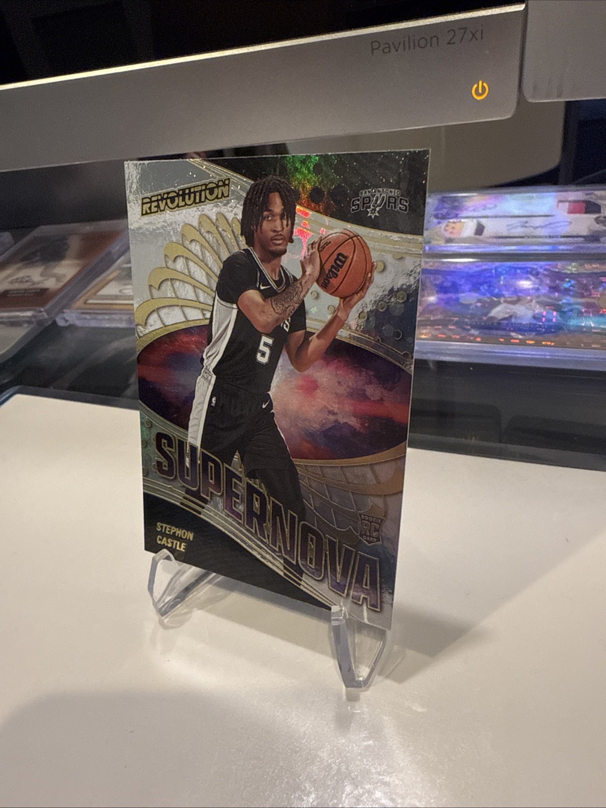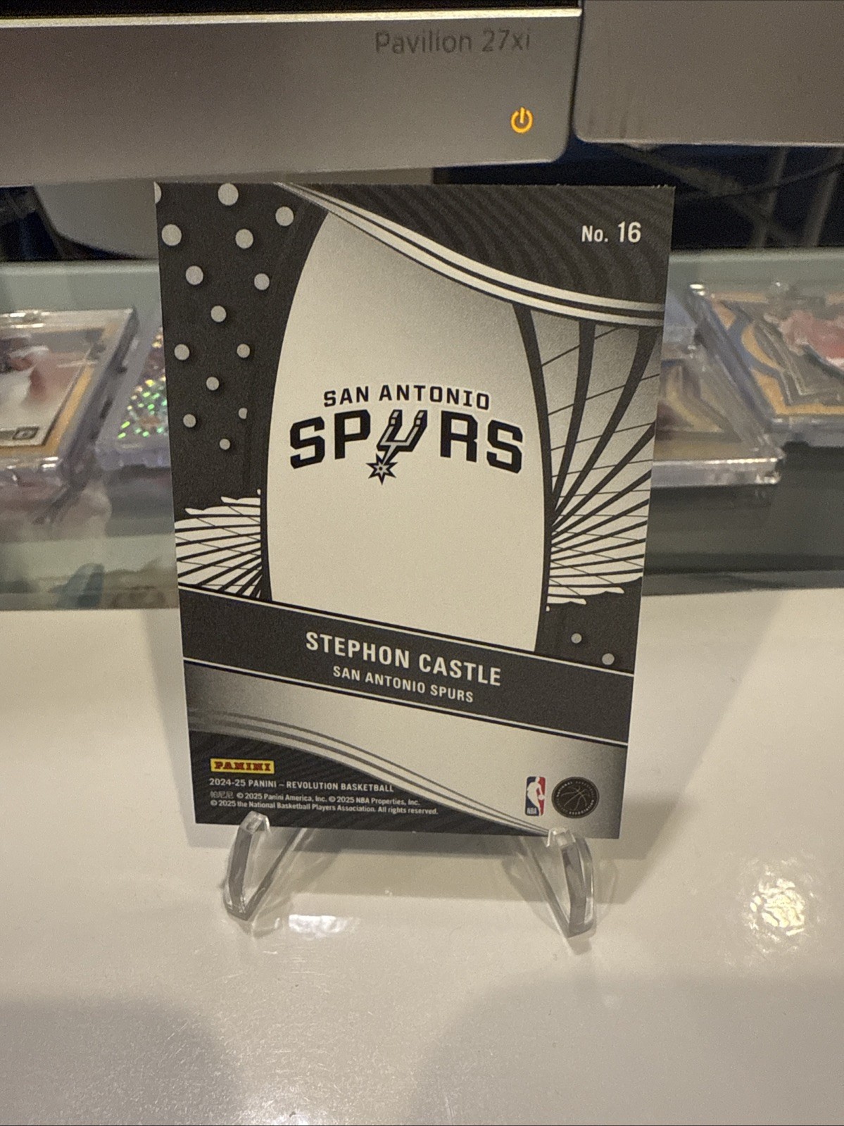 The product is a 2024-25 Panini Revolution Basketball trading card featuring Stephon Castle, a rookie player for the San Antonio Spurs. The card is part of the Supernova parallel/variety set and is numbered 16 for the 2024-25 season. As a sports trading card, it is a collectible item sought after by fans and collectors alike for its unique features and association with a promising young athlete in the National Basketball Association (NBA).