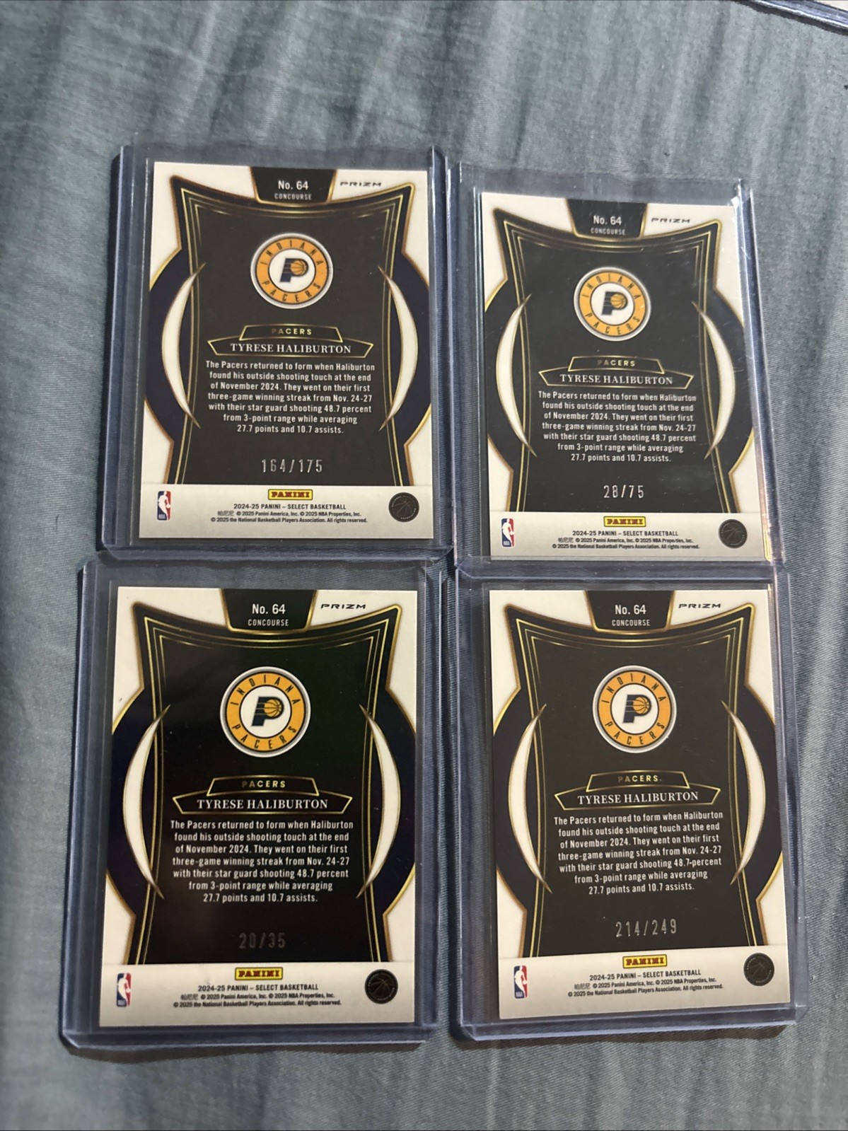 The product is a lot of 2024-25 Panini Select basketball trading cards featuring Tyrese Haliburton. These standard-sized cards are manufactured by Panini and are part of the Concourse set. The cards are made of card stock and are not autographed. They are original, not a reprint, and are in English language. The lot includes cards numbered 64, with a limited quantity of 75, 35, and 249, respectively. These cards are a sought-after collectible for fans of the NBA and basketball trading cards.