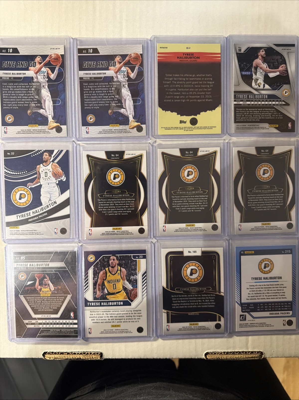 The product is a lot of 12 cards featuring Tyrese Haliburton from the 2024-25 NBA season manufactured by Panini. The cards are made of card stock and include base parallels and inserts. These sports trading cards are in English and are part of the National Basketball Association (NBA) series. The autographs are done with label or sticker formats, and the cards are not vintage. Ideal for collectors looking to add to their Tyrese Haliburton card collection. All in near mint condition