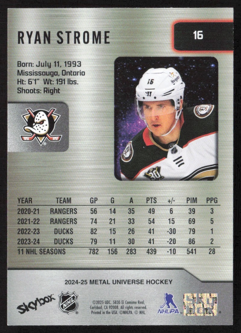 About Me Other Listings Feedback Add to Favorites Contact Me eBay Store DJ Chino Sports 2024-25 SkyBox Metal Universe Base Ryan Strome Anaheim Ducks #16 No stock photo / These are real scans or pictures Details Description: Ryan Strome Category: Hockey Year: 2024 Product: SkyBox Metal Universe Set: Base Team: Anaheim Ducks Card Number: 16 Dimensions: 3½" x 2½" SKU: HK A0000 R02 S (250) Shipping Shipping - Please see shipping for pricing and details. - Every card (excluding graded cards) will be shipped in a penny sleeve and Card Saver. Some cases in a top loader. - Any damage to your card during shipping, or not received. I will contact eBay to issue a refund. - I honor combined shipping and discounted shipping for additional items. For standard cards, $.10 each for additional cards. For more information, please check shipping details. - For Graded Cards, I will be shipping in a standard box and well protected. - PLEASE NOTE: If eBay Standard Shipping is selected. eBay Standard Delivery uses USPS Regular mail. The tracking may be delayed or will say that it has been delivered but not in your mailbox. If the tracking states "Delivered" and you don't receive your card. Please allow 3-5 days to be delivered as it seems like USPS scans as delivered at your local USPS sort facility before being delivered. If you still have not received your card, please file a claim using this link. ebay.com/resolutioncenter Returns and Claims Free returns within 30 days of purchase. About Us Welcome to my store. I have been collecting cards for 30+ years and enjoy collecting. I am starting my store so that I can share my collection to the world. Please check out my other listings and feel free to reach out to me with any questions. Thank you. Cards Information - Cards are scanned and immediately after break. - Please refer to photos for additional details. - Cards are in NMINT or better shape may have lines, smudges, different color, or dust due to the scanner. If you would like more details on this card. Please message me and will be happy to send other photos. - Cards may have minor flaws such as slight corner/edge dings, production printing, surface dimples, etc.. Please message me if you have questions. - All my cards are stored in a cool environment and in card boxes. - With listings that have multiple quantities. I do label condition, and may not be the card you see in the picture. If you would like additional photos, please let me know and will eBay message you photos. Listing By Kronocard trading cards software v2.8.4.8