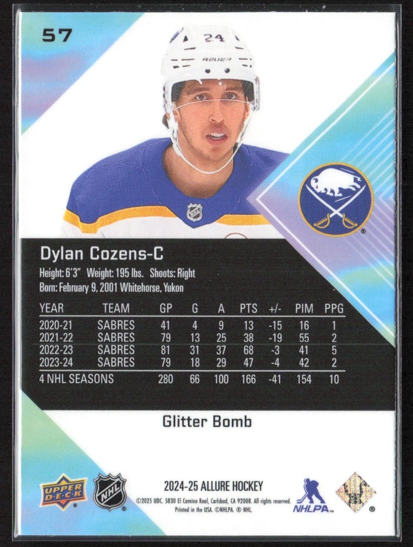 About Me Other Listings Feedback Add to Favorites Contact Me eBay Store DJ Chino Sports 2024-25 Upper Deck Allure Glitter Bomb Dylan Cozens St. Louis Blues #57 No stock photo / These are real scans or pictures Details Description: Dylan Cozens Category: Hockey Year: 2024 Product: Upper Deck Allure Set: Glitter Bomb Team: St. Louis Blues Card Number: 57 Dimensions: 3½" x 2½" SKU: HK A0000 R02 L (56) Shipping Shipping - Please see shipping for pricing and details. - Every card (excluding graded cards) will be shipped in a penny sleeve and Card Saver. Some cases in a top loader. - Any damage to your card during shipping, or not received. I will contact eBay to issue a refund. - I honor combined shipping and discounted shipping for additional items. For standard cards, $.10 each for additional cards. For more information, please check shipping details. - For Graded Cards, I will be shipping in a standard box and well protected. - PLEASE NOTE: If eBay Standard Shipping is selected. eBay Standard Delivery uses USPS Regular mail. The tracking may be delayed or will say that it has been delivered but not in your mailbox. If the tracking states "Delivered" and you don't receive your card. Please allow 3-5 days to be delivered as it seems like USPS scans as delivered at your local USPS sort facility before being delivered. If you still have not received your card, please file a claim using this link. ebay.com/resolutioncenter Returns and Claims Free returns within 30 days of purchase. About Us Welcome to my store. I have been collecting cards for 30+ years and enjoy collecting. I am starting my store so that I can share my collection to the world. Please check out my other listings and feel free to reach out to me with any questions. Thank you. Cards Information - Cards are scanned and immediately after break. - Please refer to photos for additional details. - Cards are in NMINT or better shape may have lines, smudges, different color, or dust due to the scanner. If you would like more details on this card. Please message me and will be happy to send other photos. - Cards may have minor flaws such as slight corner/edge dings, production printing, surface dimples, etc.. Please message me if you have questions. - All my cards are stored in a cool environment and in card boxes. - With listings that have multiple quantities. I do label condition, and may not be the card you see in the picture. If you would like additional photos, please let me know and will eBay message you photos. Listing By Kronocard trading cards software v2.8.4.8